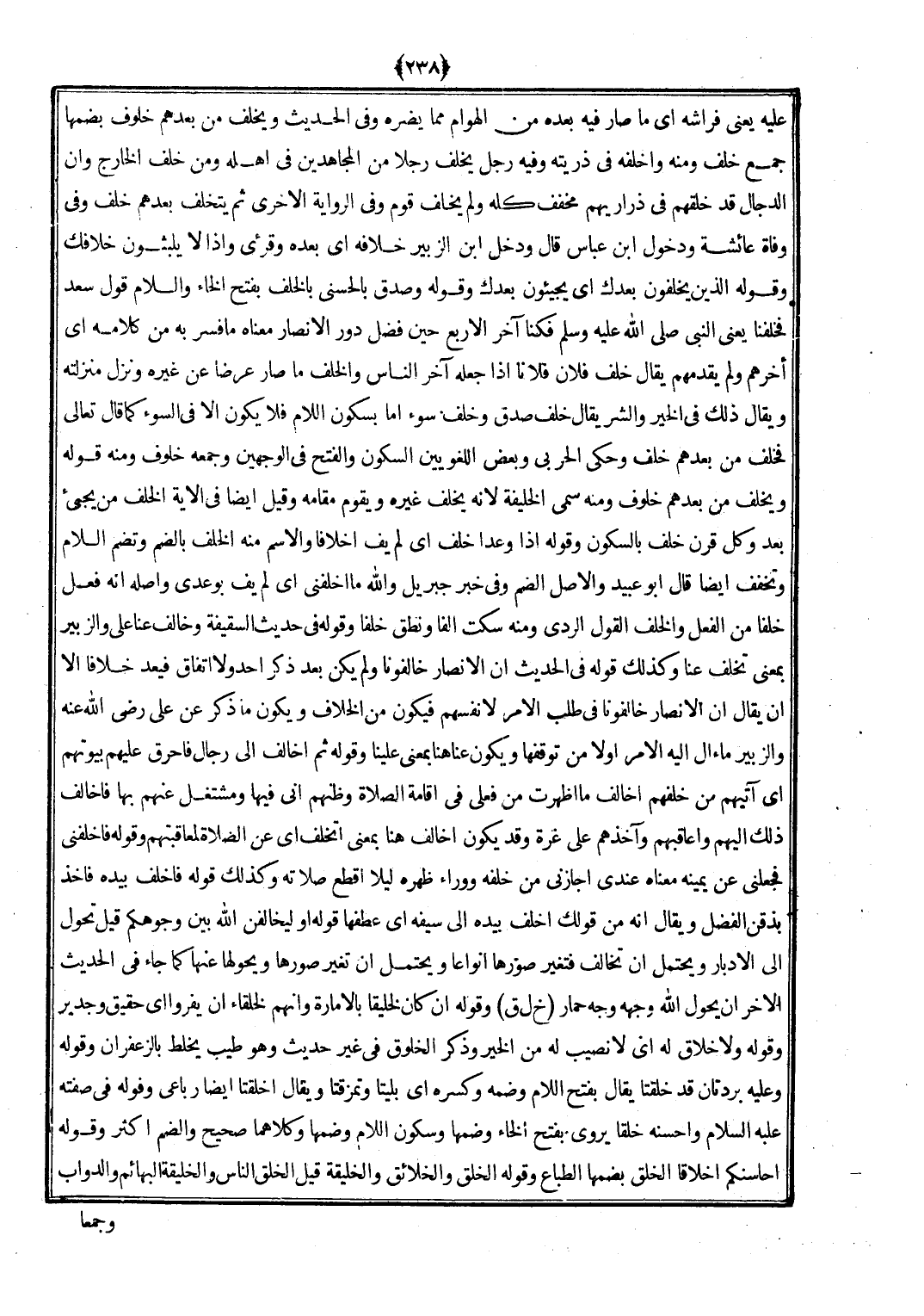 (وَحكى الْحَرْبِيّ وَبَعض اللغويين السّكُون وَالْفَتْح فِي الْوَجْهَيْنِ وَجمعه خلوف وَمِنْه قَوْله ويخلف من بعدهمْ خلوف وَمِنْه سمي الْخَلِيفَة لِأَنَّهُ يخلف غَيره وَيقوم مقَامه وَقيل أَيْضا فِي الْآيَة الْخلف من يجيئ بعد وكل قرن خلف بِالسُّكُونِ وَقَوله إِذا وَعدا خلف أَي لم يَفِ إخلافا وَالِاسْم مِنْهُ الْخلف بِالضَّمِّ وتضم اللَّام وتخفف أَيْضا قَالَ أَبُو عبيد وَالْأَصْل الضَّم وَفِي خبر جِبْرِيل وَالله مَا أخلفني أَي لم يَفِ بوعدي وَأَصله أَنه فعل خلفا من الْفِعْل وَالْخلف القَوْل الردي وَمِنْه سكت ألفا ونطق خلفا وَقَوله فِي حَدِيث السَّقِيفَة وَخَالف عَنَّا عَليّ وَالزُّبَيْر بِمَعْنى تخلف عَنَّا وَكَذَلِكَ قَوْله فِي الحَدِيث أَن الْأَنْصَار خالفونا وَلم يكن بعد ذكر أحد وَلَا اتِّفَاق فيعد خلافًا إِلَّا أَن يُقَال أَن الْأَنْصَار خالفونا فِي طلب الْأَمر لأَنْفُسِهِمْ فَيكون من الْخلاف وَيكون مَا ذكر عَن عَليّ رَضِي الله عَنهُ وَالزُّبَيْر مَا آل إِلَيْهِ الْأَمر أَولا من توقفها وَيكون عَنَّا هُنَا بِمَعْنى علينا وَقَوله ثمَّ أُخَالِف إِلَى رجال فَأحرق عَلَيْهِم بُيُوتهم أَي آتيهم من خَلفهم أُخَالِف مَا أظهرت من فعلي فِي إِقَامَة الصَّلَاة وظنهم أَنِّي فِيهَا ومشتغل عَنْهُم بهَا فأخالف ذَلِك إِلَيْهِم وأعاقبهم وآخذهم على غرَّة وَقد يكون أُخَالِف هُنَا بِمَعْنى أَتَخَلَّف أَي عَن الصَّلَاة لمعاقبتهم وَقَوله فأخلفني فجعلني عَن يَمِينه مَعْنَاهُ عِنْدِي أجازني من خَلفه ووراء ظَهره لَيْلًا أقطع صلَاته وَكَذَلِكَ قَوْله فأخلف بِيَدِهِ فَأخذ بذقن الْفضل وَيُقَال أَنه من قَوْلك أخلف بِيَدِهِ إِلَى سَيْفه أَي عطفها قَوْله أَو ليخالفن الله بَين وُجُوهكُم قيل تحول إِلَى الأدبار وَيحْتَمل أَن تخَالف فَتغير صورها أنواعا وَيحْتَمل أَن تغير صورها ويحولها عَنْهَا كَمَا جَاءَ فِي الحَدِيث الآخر أَن يحول الله وَجهه وَجه حمَار