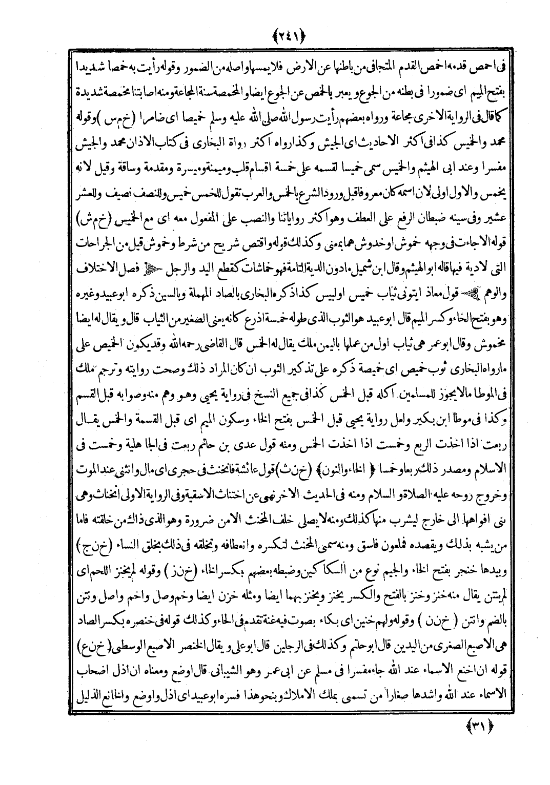فِي أَخْمص قدمه أَخْمص الْقدَم المتجافى من بَاطِنهَا عَن الأَرْض فَلَا يَمَسهَا وَأَصله من الضمور وَقَوله رَأَيْت بِهِ خمصا شَدِيدا بِفَتْح الْمِيم أَي ضمورا فِي بَطْنه من الْجُوع ويعبر بالخمص عَن الْجُوع أَيْضا والمخمصة سنة المجاعة وَمِنْه إصابتنا مَخْمَصَة شَدِيدَة كَمَا قَالَ فِي الرِّوَايَة الْأُخْرَى مجاعَة وَرَوَاهُ بَعضهم رَأَيْت رَسُول الله (صلى الله عَلَيْهِ وَسلم) خميصا أَي ضامرا