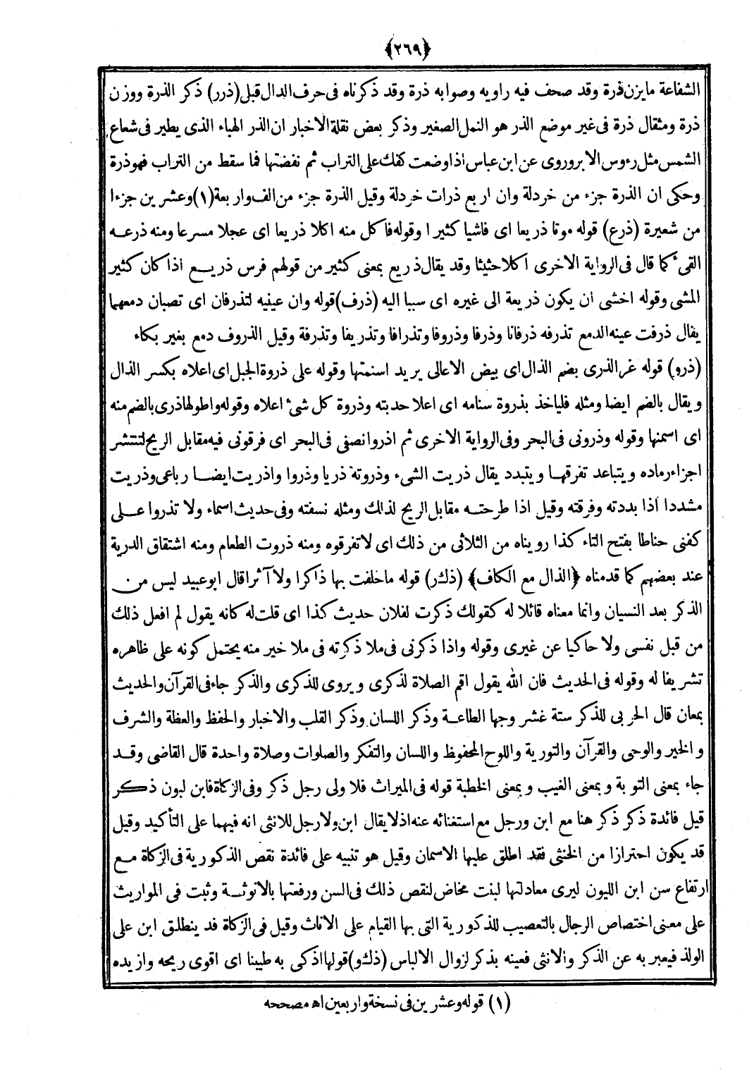 (ذرو) قَوْله غر الذري بِضَم الذَّال أَي بيض الأعالي يُرِيد أسنمتها وَقَوله على ذرْوَة الْجَبَل أَي أَعْلَاهُ بِكَسْر الذَّال وَيُقَال بِالضَّمِّ أَيْضا وَمثله فليأخذ بِذرْوَةِ سنامه أَي أعلا حدبته وذروة كل شَيْء أَعْلَاهُ وَقَوله وأطولها ذرى بِالضَّمِّ مِنْهُ أَي اسمنها وَقَوله وذروني فِي الْبَحْر وَفِي الرِّوَايَة الْأُخْرَى ثمَّ أذروا نصفي فِي الْبَحْر أَي فرقوني فِيهِ مُقَابل الرّيح لتنتشر أَجزَاء رماده ويتباعد تفرقها ويتبدد يُقَال ذريت الشَّيْء وذروته ذريا وذروا وأذريت أَيْضا رباعي وذريت مشددا إِذا بددته وفرقته وَقيل إِذا طرحته مُقَابل الرّيح لذَلِك وَمثله نسفته وَفِي حَدِيث أَسمَاء وَلَا تذروا على كفني حناطا بِفَتْح التَّاء كَذَا روينَاهُ من الثلاثي من ذَلِك أَي لَا تفرقوه وَمِنْه ذروت الطَّعَام وَمِنْه اشتقاق الدرية عِنْد بَعضهم كَمَا قدمْنَاهُ