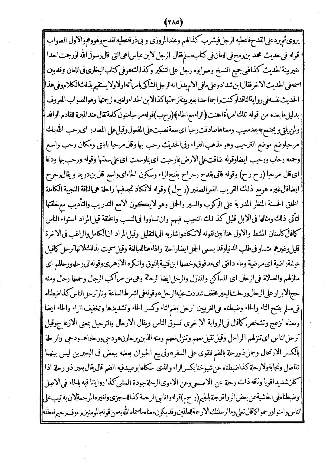 (ر ح ل) وَقَوله لَا تكَاد تَجِد فِيهَا رَاحِلَة هِيَ النَّاقة النجيبة الْكَامِلَة الْخلق الْحَسَنَة المنظر المدربة على الرّكُوب وَالسير وَالْحمل وَهُوَ لَا يكون إِلَّا مَعَ التدريب والتأديب مَعَ خلقتها لتأتي ذَلِك ومثالها فِي الْإِبِل قَلِيل كَذَلِك النجيب فيهم وَأَن تساووا فِي النّسَب والخلقة قيل المُرَاد اسْتِوَاء النَّاس كَمَا قَالَ كأسنان الْمشْط وَالْأول هُنَا أبين لقَوْله لَا تكادوا شَاربه إِلَى التقليل وَقيل المُرَاد أَن الْكَامِل والراغب فِي الْآخِرَة قَلِيل وَغَيرهم متساو فِي طلب الدُّنْيَا وَقد يُسمى الْجمل أَيْضا رَاحِلَة وَالْهَاء هُنَا للْمُبَالَغَة وَقيل سميت بذلك لأنهاترحل كَمَا قيل عيشة راضية أَي مرضية وَمَاء دافق أَي مدفوق وخصها ابْن قُتَيْبَة بالنوق وَأنْكرهُ الْأَزْهَرِي وَقَوله إِلَى رَحْله ورحالهم أَي مَنَازِلهمْ وَالصَّلَاة فِي الرّحال أَي المساكن والمنازل والرحل أَيْضا الرحالة وَهِي من مراكب الرِّجَال وَجَمعهَا رحال وَمِنْه حج الْأَبْرَار على الرّحال ورحلت الْبَعِير مخفف شددت عَلَيْهِ الرحل