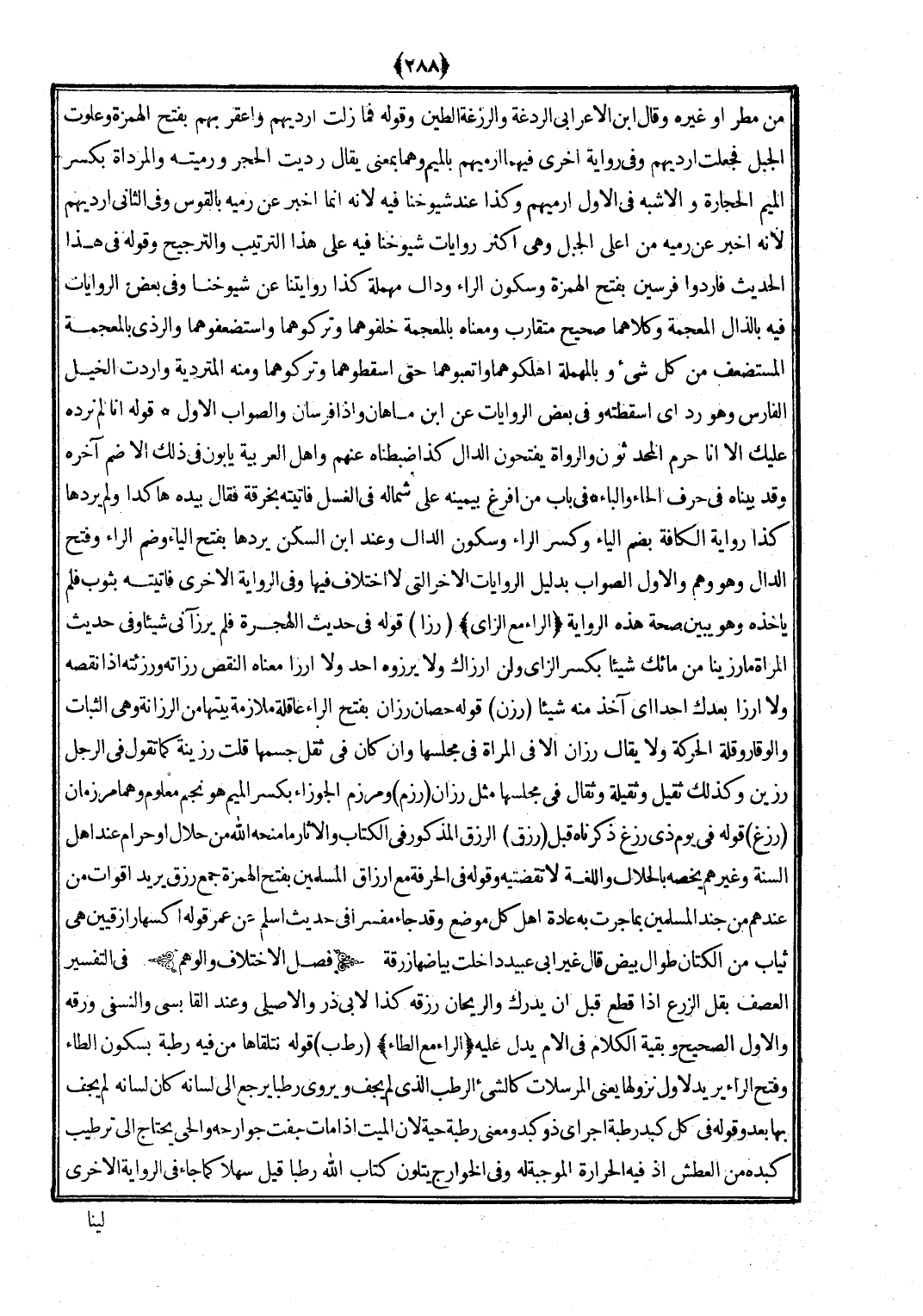 (رزق) الرزق الْمَذْكُور فِي الْكتاب والْآثَار مَا منحه الله من حَلَال أَو حرَام عِنْد أهل السّنة وَغَيرهم يَخُصُّهُ بالحلال واللغة لَا تَقْتَضِيه وَقَوله فِي الحرفة مَعَ إرزاق الْمُسلمين بِفَتْح الْهمزَة جمع رزق يُرِيد أقوات من عِنْدهم من جند الْمُسلمين بِمَا جرت بِهِ عَادَة أهل كل مَوضِع وَقد جَاءَ مُفَسرًا فِي حَدِيث أسلم عَن عمر قَوْله أكسها رازقيين هِيَ ثِيَاب من الْكَتَّان طوال بيض قَالَ غير أبي عبيد داخلت بياضها زرقة.