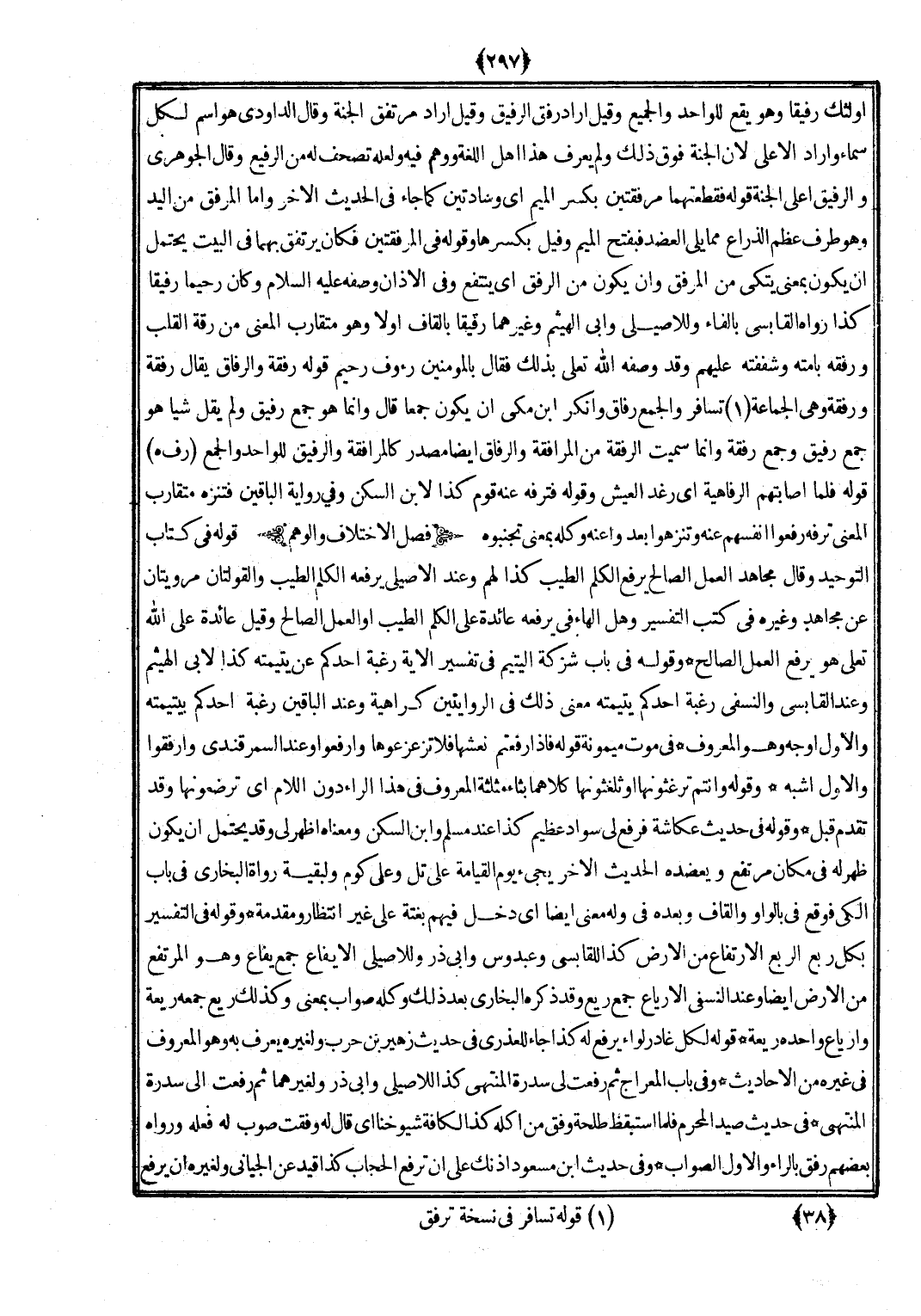 أُولَئِكَ رَفِيقًا وَهُوَ يَقع للْوَاحِد والجميع وَقيل أَرَادَ رفق الرفيق وَقيل أَرَادَ مرتفق الْجنَّة وَقَالَ الدَّاودِيّ هُوَ اسْم لكل سَمَاء وَأَرَادَ الْأَعْلَى لِأَن الْجنَّة فَوق ذَلِك وَلم يعرف هَذَا أهل اللُّغَة وَوهم فِيهِ وَلَعَلَّه تصحف لَهُ من الرفيع وَقَالَ الْجَوْهَرِي والرفيق أَعلَى الْجنَّة قَوْله فقطعتهما مرفقتين بِكَسْر الْمِيم أَي وسادتين كَمَا جَاءَ فِي الحَدِيث الآخر وَأما الْمرْفق من الْيَد وَهُوَ طرف عظم الذِّرَاع مِمَّا يَلِي الْعَضُد فبفتح الْمِيم وَقيل بِكَسْرِهَا وَقَوله فِي المرفقتين فَكَانَ يرتفق بهما فِي الْبَيْت يحْتَمل أَن يكون بِمَعْنى يتكئ من الْمرْفق وَأَن يكون من الرِّفْق أَي ينْتَفع وَفِي الْأَذَان وَصفه (صلى الله عَلَيْهِ وَسلم) وَكَانَ رحِيما رَفِيقًا كَذَا رَوَاهُ الْقَابِسِيّ بِالْفَاءِ وللأصيلي وَأبي الْهَيْثَم وَغَيرهمَا رَقِيقا بِالْقَافِ أَولا وَهُوَ مُتَقَارب الْمَعْنى من رقة الْقلب ورفقه بأمته وشففته عَلَيْهِم وَقد وَصفه الله تَعَالَى بذلك فَقَالَ