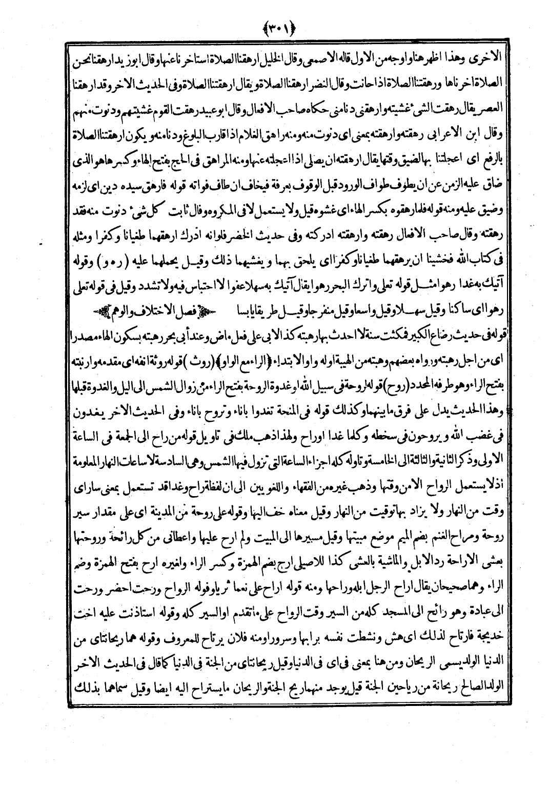 (روح) قَوْله لَرَوْحَة فِي سَبِيل الله أَو غدْوَة الروحة بِفَتْح الرَّاء من زَوَال الشَّمْس إِلَى اللَّيْل والغدوة قبلهَا وَهَذَا الحَدِيث يدل على فرق مَا بَينهمَا وَكَذَلِكَ قَوْله فِي المنحة تغدوا بأناء وَتَروح بأناء وَفِي الحَدِيث الآخر يَغْدُونَ فِي غضب الله وَيَرُوحُونَ فِي سخطه وَكلما غَدا أَو رَاح وَلِهَذَا ذهب ملك فِي تَأْوِيل قَوْله من رَاح إِلَى الْجُمُعَة فِي السَّاعَة الأولى وَذكر الثَّانِيَة وَالثَّالِثَة إِلَى الْخَامِسَة وتأوله كُله أَجزَاء السَّاعَة الَّتِي تَزُول فِيهَا الشَّمْس وَهِي السَّادِسَة لَا سَاعَات النَّهَار الْمَعْلُومَة إِذْ لَا يسْتَعْمل الرواح إِلَّا من وَقتهَا وَذهب غَيره من الْفُقَهَاء واللغويين إِلَى أَن لَفْظَة رَاح وَغدا قد تسْتَعْمل بِمَعْنى سَار أَي وَقت من النَّهَار وَلَا يُزَاد بهَا تَوْقِيت من النَّهَار وَقيل مَعْنَاهَا خف إِلَيْهَا وَقَوله على رَوْحَة من الْمَدِينَة أَي على مِقْدَار سير رَوْحَة ومراح الْغنم بِضَم الْمِيم مَوضِع مبيتها وَقيل مسيرها إِلَى الْمبيت وَلم أرح عيلها وَأَعْطَانِي من كل رَائِحَة وروحتها بعشى إِلَّا رَاحَة رد الْإِبِل والماشية بالْعَشي كَذَا للأصيلي ارج بِضَم الْهمزَة وَكسر الرَّاء وَلغيره أرح بِفَتْح الْهمزَة وَضم الرَّاء وهما صَحِيحَانِ يُقَال أراح الرجل إبِله وراحها وَمِنْه قَوْله أراح على نعما ثريا وَقَوله الرواح ورحت أحضر ورحت إِلَى عبَادَة وَهُوَ رائح إِلَى الْمَسْجِد كُله من السّير وَقت الرواح على مَا تقدم أَو السّير كُله وَقَوله اسْتَأْذَنت عَلَيْهِ أُخْت خَدِيجَة فارتاح لذَلِك أَي هش ونشطت نَفسه برأبها وسرور أَو مِنْهُ فلَان يرتاح للمعروف وَقَوله هما ريحانتاي من الدُّنْيَا الْوَلَد يُسمى الريحان وَمن هُنَا بِمَعْنى فِي أَي فِي الدُّنْيَا وَقيل ريحانتاي من الْجنَّة فِي الدُّنْيَا كَمَا قَالَ فِي الحَدِيث الآخر الْوَلَد الصَّالح رَيْحَانَة من رياحين الْجنَّة قيل يُوجد مِنْهُمَا ريح الْجنَّة وَالريحَان مَا يستراح إِلَيْهِ أَيْضا وَقيل سماهما بذلك