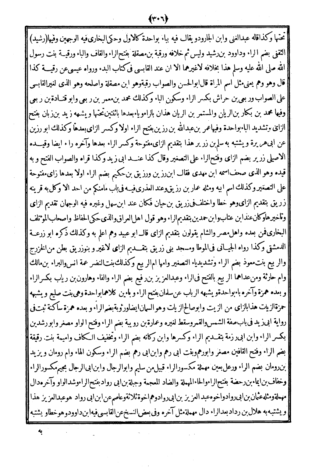 (رشيد) الثَّقَفِيّ بِضَم الرَّاء وداوود بن رشيد وَلَيْسَ ثمَّ خِلَافه ورقبة بن مصقلة بِفَتْح الرَّاء وَالْقَاف وَالْبَاء ورقية بنت رَسُول الله (صلى الله عَلَيْهِ وَسلم) هَذَا بِخِلَافِهِ لَا غَيرهمَا إِلَّا أَن عِنْد الْقَابِسِيّ فِي كتاب البدء وَرَوَاهُ عِيسَى عَن رقية كَذَا قَالَ وَهُوَ وهم يَعْنِي مثل اسْم الْمَرْأَة قَالَ أَبُو الْحسن وَالصَّوَاب رَقَبَة وَهُوَ ابْن مصقلة وَأَصْلحهُ وَهُوَ الَّذِي لغير الْقَابِسِيّ على الصَّوَاب ورِبْعِي بن حِرَاش بِكَسْر الرَّاء وَسُكُون الْبَاء وَكَذَلِكَ مُحَمَّد بن معمر بن ربعي وَأَبُو قَتَادَة بن ربعي وفيهَا مُحَمَّد بن بكار بن الريان والمستمر بن الريان هَذَانِ بالراء وياء بعْدهَا بِاثْنَتَيْنِ تحتهَا ويشبهه زيد بن زبان بِفَتْح الزَّاي وَتَشْديد الْبَاء بِوَاحِدَة وفيهَا عمر بن عبدا لله بن رزين بِفَتْح الرَّاء أَولا وَكسر الزَّاي بعْدهَا وَكَذَلِكَ أَبُو زرين عَن أبي هُرَيْرَة وَيشْتَبه بِهِ سلم زرير هَذَا الْقَدِيم الزَّاي مَفْتُوحَة وَكسر الرَّاء بعْدهَا وَآخره رَاء أَيْضا وَقَيده الْأصيلِيّ زرير بِضَم الزَّاي وَفتح الرَّاء على التصغير وَقَالَ كَذَا عِنْد أبي زيد وَكَذَا قراه وَالصَّوَاب الْفَتْح وَبِه قَيده وَهُوَ الَّذِي صحف اسْمه ابْن مهْدي فَقَالَ ابْن رزين ورزيق بن حَكِيم بِضَم الرَّاء أَولا بعْدهَا زَاي مَفْتُوحَة على التصغير وَكَذَلِكَ اسْم أَبِيه وَمثله عمار بن رُزَيْق وَعند العذري فِيهِ فِي بَاب مَا مِنْكُم من أحد إِلَّا وكل بِهِ قرينه زُرَيْق بِتَقْدِيم الزَّاي وَهُوَ خطأ وَاخْتلف فِي زُرَيْق بن حَيَّان فَكَانَ عندابن سهل وَغَيره فِيهِ الْوَجْهَانِ تَقْدِيم الزَّاي وتأخيرها وَكَانَ عِنْد ابْن عتاب وَابْن حمدين بِتَقْدِيم الرَّاء وَهُوَ قَول أهل الْعرَاق وَالَّذِي حكى الْحفاظ وَأَصْحَاب المؤتلف البُخَارِيّ فَمن بعده وَأهل مصر وَالشَّام يَقُولُونَ بِتَقْدِيم الزَّاي قَالَ أَبُو عبيد وهم أعلم بِهِ وَكَذَلِكَ ذكره أَبُو زرْعَة الدِّمَشْقِي وَكَذَا رَوَاهُ الجياني فِي الْمُوَطَّأ وَمَسْجِد بني زُرَيْق بِتَقْدِيم الزَّاي لَا غير وَبَنُو زُرَيْق بطن من الْخَزْرَج وَالربيع بنت معوذ بِضَم الرَّاء وَتَشْديد يَاء التصغير وَأمّهَا أم الرّبيع وَكَذَلِكَ بنت النَّضر عمَّة أنس والبراء بن مَالك وَأم حَارِثَة وَمن عداهما الرّبيع بِالْفَتْح فِي الرَّاء وَعبد الْعَزِيز بن رفيع بِضَم الرَّاء وَالْفَاء وَهَارُون بن رياب بِكَسْر الرَّاء وَبعده همزَة وَآخره بَاء بِوَاحِدَة ويشبهه الربَاب عَن سلمَان بِفَتْح الرَّاء وبائين كِلَاهُمَا بِوَاحِدَة وَهِي بنت صليعٍ ويشبهه حَمْزَة الزيات هَذَا بالزاي من الزَّيْت وَأَبُو صَالح الزيات وَهُوَ السمان أَيْضا ورؤية بِضَم الرَّاء وَبعده همزَة سَاكِنة ثَبت فِي رِوَايَة أبي زيد فِي بَاب صفة الشَّمْس وَالْقَمَر وَسقط لغيره وَعمارَة بن رويبة بِضَم الرَّاء وَفتح الْوَاو مصغر وَأَبُو رشدين بِكَسْر الرَّاء وَابْن أبي رزمة بِتَقْدِيم الرَّاء وَكسرهَا وَابْن ركَانَة بِضَم الرَّاء وَتَخْفِيف الْكَاف وَأُمَيْمَة بنت رقيقَة بِضَم الرَّاء وَفتح القافين مصغر وَأَبُو رهم وَبنت أبي رهم وَابْن أبي رهم بِضَم الرَّاء وَسُكُون الْهَاء وَأم رُومَان وَيزِيد بن رُومَان بِضَم الرَّاء ورعل بِعَين مُهْملَة مكسور الرَّاء قبيل من سليم وَأَبُو الرِّجَال وَابْن أبي الرِّجَال بجيم مكسور الرَّاء وخفاف بن إِيمَاء بن رحضة بِفَتْح الرَّاء والحاء الْمُهْملَة وَالضَّاد الْمُعْجَمَة وجبلة بن أبي رواد بِفَتْح الرَّاء وَشد الْوَاو وَآخره دَال مُهْملَة وَمثله عُثْمَان بن أبي رواد وَأَخُوهُ عبد الْعَزِيز بن أبي رواد وهم أخوة ثَلَاثَة وَعَاصِم عَن ابْن أبي رواد هُوَ عبد الْعَزِيز هَذَا وَيشْتَبه بِهِ هِلَال بن رداد بعد الرَّاء دَال مُهْملَة مثل آخِره وَفِي بع