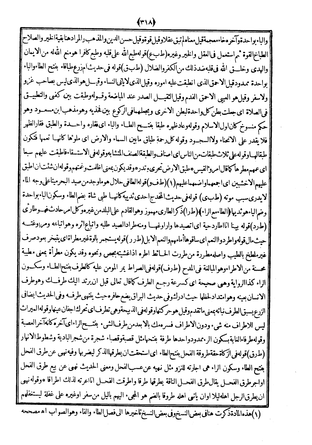 (ط ر ف) قَوْله فِي الصِّرَاط يمر الْمُؤمن عَلَيْهِ كالطرف بِفَتْح الطَّاء وَسُكُون الرَّاء كَذَا الرِّوَايَة وَهِي صَحِيحَة أَي كسرعة رَجَعَ الطّرف كَمَا قَالَ تَعَالَى قبل أَن يرْتَد إِلَيْك طرفك وَهُوَ طرف الْإِنْسَان بِعَيْنِه وَهُوَ امتداد لحظها حَيْثُ أدْرك وَفِي حَدِيث الْبراق يضع حَافره حَيْثُ يَنْتَهِي طرفه وَفِي الحَدِيث أَيْضا فِي الزَّرْع يسْبق الطّرف نَبَاته بِمَعْنى مَا تقدم وَقيل هُوَ حركتها وَقَوله فِي الذَّبِيحَة وَهِي تطرف أَي تحرّك أجفان عينهَا وَقَوله الْمِيرَاث لَيْسَ للأطراف مِنْهُ شَيْء وَدون الْأَطْرَاف فسره مك بالأبعد من طرف الشَّيْء بِفَتْح الرَّاء أَي آخِره كَأَنَّهُ آخر الْعصبَة وَقَوله طرفاء الغابة بِسُكُون الرَّاء مَمْدُود وأحدها طرفَة بِفَتْحِهَا مثل قَصَبَة وقصباء شَجَرَة من شجر الْبَادِيَة وشطوط الْأَنْهَار