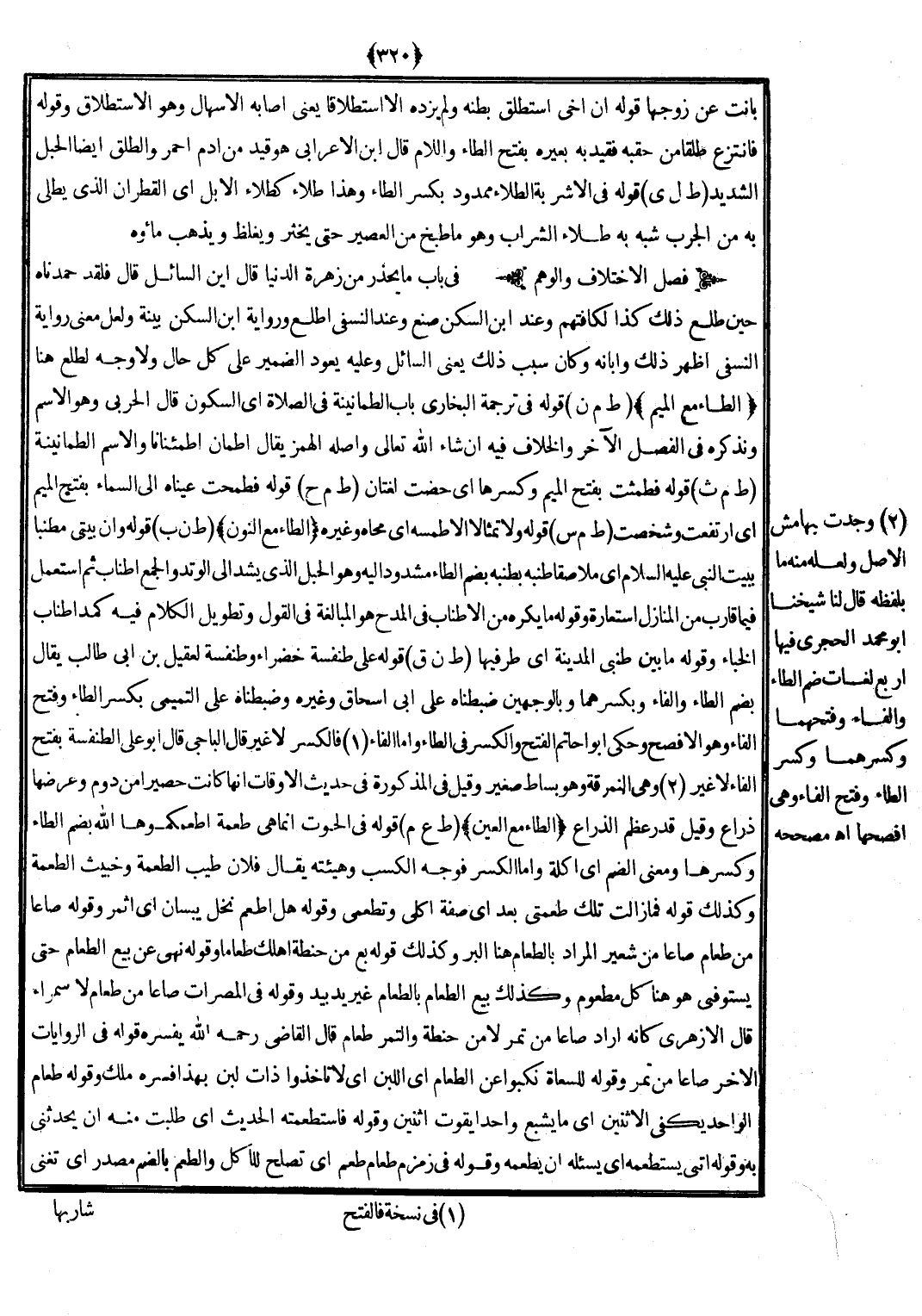 (ط ع م) قَوْله فِي الْحُوت إِنَّمَا هِيَ طعمة أطعمكموها الله بِضَم الطَّاء وَكسرهَا وَمعنى الضَّم أَي أَكلَة وَأما الْكسر فَوجه الْكسْب وهيئته يُقَال فلَان طيب الطعمة وخبيث الطعمة وَكَذَلِكَ قَوْله فمازالت تِلْكَ طعمتي بعد أَي صفة أكلي وتطعمي وَقَوله هَل أطْعم نخل يبسان أَي أثمر وَقَوله صَاعا من طَعَام صَاعا من شعير المُرَاد بِالطَّعَامِ هُنَا الْبر وَكَذَلِكَ قَوْله بِعْ من حِنْطَة أهلك طَعَاما وَقَوله نهى عَن بيع الطَّعَام حَتَّى يَسْتَوْفِي هُوَ هُنَا كل مطعوم وَكَذَلِكَ بيع الطَّعَام بِالطَّعَامِ غير يدبيد وَقَوله فِي المصرات صَاعا من طَعَام لَا سمراء قَالَ الْأَزْهَرِي كَأَنَّهُ أَرَادَ صَاعا من تمر لَا من حِنْطَة وَالتَّمْر طَعَام قَالَ القَاضِي رَحمَه الله يفسره قَوْله فِي الرِّوَايَات الْأُخَر صَاعا من تمر وَقَوله للسعاة نكبوا عَن الطَّعَام أَي اللَّبن أَي لَا تَأْخُذُوا ذَات لبن بِهَذَا فسره ملك وَقَوله طَعَام الْوَاحِد يَكْفِي الِاثْنَيْنِ أَي مَا يشْبع وَاحِدًا يقوت اثْنَيْنِ وَقَوله فاستطعمته الحَدِيث أَي طلبت مِنْهُ أَن يحدثني بِهِ وَقَوله أَتَى يستطعمه أَي يسْأَله أَن يطعمهُ وَقَوله فِي زَمْزَم طَعَام طعم أَي تصلح للْأَكْل والطعم بِالضَّمِّ مصدر أَي تغني