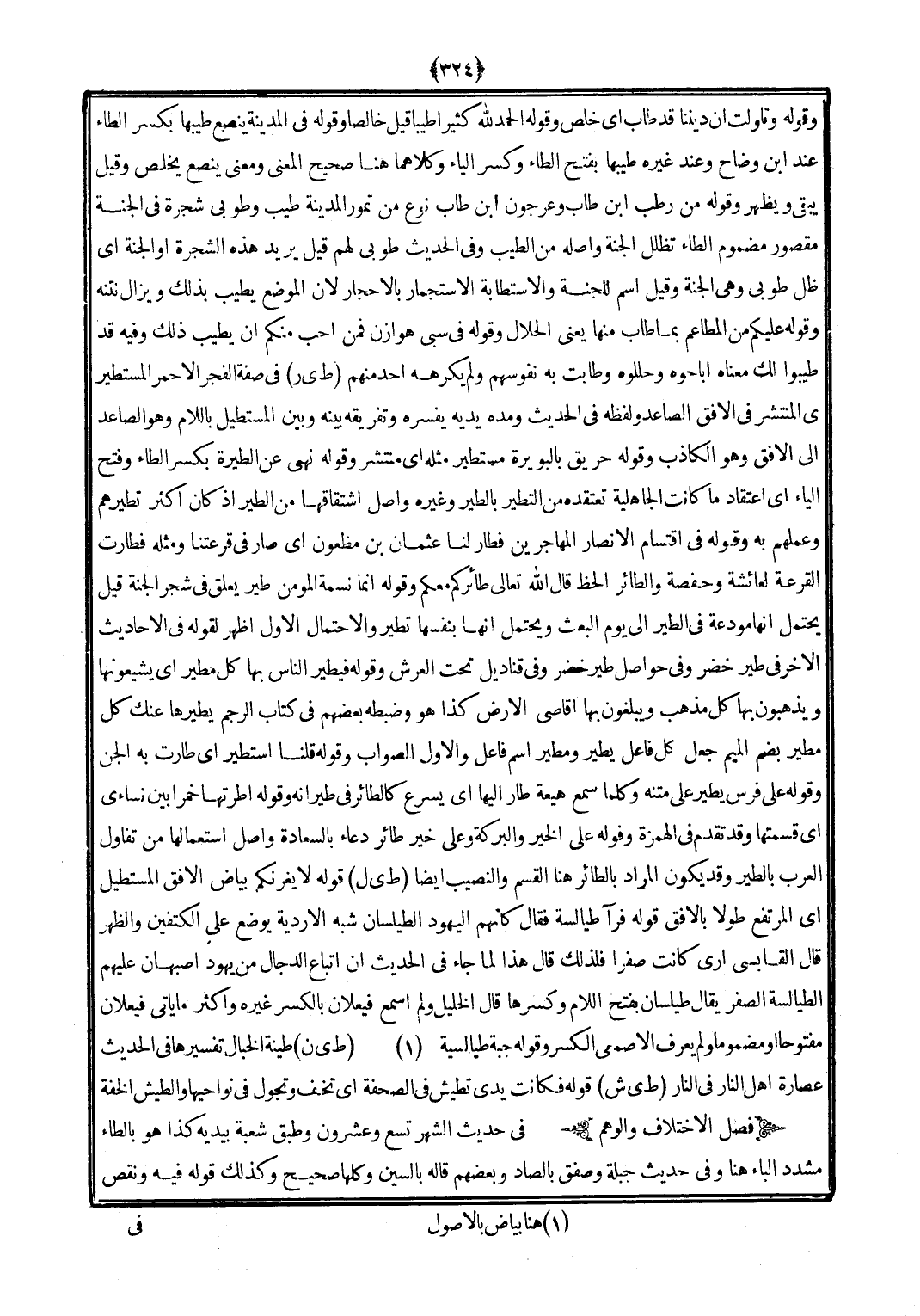 (ط ي ر) فِي صفة الْفجْر الْأَحْمَر المستطير أَي الْمُنْتَشِر فِي الْأُفق الصاعد وَلَفظه فِي الحَدِيث ومده يَدَيْهِ يفسره وتفريقه بَينه وَبَين المستطيل بِاللَّامِ وَهُوَ الصاعد إِلَى الْأُفق وَهُوَ الْكَاذِب وَقَوله حريق بالبويرة مستطير مثله أَي منتشر وَقَوله نهى عَن الطَّيرَة بِكَسْر الطَّاء وَفتح الْيَاء أَي اعْتِقَاد مَا كَانَت الْجَاهِلِيَّة تعتقده من التطير بالطير وَغَيره وأصل اشتقاقها من الطير إِذْ كَانَ أَكثر تطيرهم وعملهم بِهِ وَقَوله فِي اقتسام الْأَنْصَار الْمُهَاجِرين فطار لنا عُثْمَان بن مَظْعُون أَي صَار فِي قرعتنا وَمثله فطارت الْقرعَة لعَائِشَة وَحَفْصَة والطائر الْحَظ قَالَ الله تَعَالَى طائركم مَعكُمْ وَقَوله إِنَّمَا نسمَة الْمُؤمن طير يعلق فِي شجر الْجنَّة قيل يحْتَمل أَنَّهَا مودعة فِي الطير إِلَى يَوْم الْبَعْث وَيحْتَمل أَنَّهَا بِنَفسِهَا تطير وَالِاحْتِمَال الأول أظهر لقَوْله فِي الْأَحَادِيث الْأُخَر فِي طير خضر وَفِي حواصل طير خضر وَفِي قناديل تَحت الْعَرْش وَقَوله فيطير النَّاس بهَا كل مطير أَي يشيعونها ويذهبون بهَا كل مَذْهَب ويبلغون بهَا أقاصي الأَرْض كَذَا هُوَ وَضَبطه بَعضهم فِي كتاب الرَّجْم يطيرها عَنْك كل مطير بِضَم الْمِيم جعل كل فَاعل يطير ومطير اسْم فَاعل وَالْأول الصَّوَاب وَقَوله قُلْنَا استطير أَي طارت بِهِ الْجِنّ وَقَوله على فرس يطير على مَتنه وَكلما سمع هيعة طَار إِلَيْهَا أَي يسْرع كالطائر فِي طيرانه وَقَوله أطرتها خمرًا بَين نسَائِي أَي قسمتهَا وَقد تقدم فِي الْهمزَة وَقَوله على الْخَيْر وَالْبركَة وعَلى خير طَائِر دُعَاء بالسعادة وأصل اسْتِعْمَالهَا من تفاؤل الْعَرَب بالطير وَقد يكون المُرَاد بالطائر هُنَا الْقسم والنصيب أَيْضا