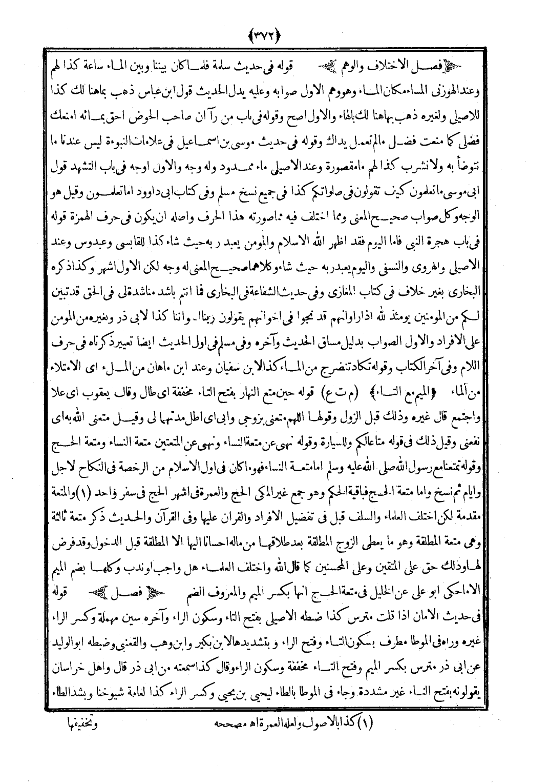 قَوْله فِي حَدِيث سَلمَة فَلَمَّا كَانَ بَيْننَا وَبَين المَاء سَاعَة كَذَا لَهُم وَعند الْهَوْزَنِي الْمسَاء مَكَان المَاء وَهُوَ وهم الأول صَوَابه وَعَلِيهِ يدل الحَدِيث قَول ابْن عَبَّاس ذهب بِمَا هُنَا لَك كَذَا للأصيلي وَلغيره ذهب بهَا هُنَا لَك بِالْهَاءِ وَالْأول أصح وَقَوله فِي بَاب من رأى أَن صَاحب الْحَوْض أَحَق بمائه أمنعك فضلي كَمَا منعت فضل مَا لم تعْمل يداك وَقَوله فِي حَدِيث مُوسَى بن إِسْمَاعِيل فِي عَلَامَات النبوءة لَيْسَ عندنَا مَا نَتَوَضَّأ بِهِ وَلَا نشرب كَذَا لَهُم مَا مقصوره وَعند الْأصيلِيّ مَاء مَمْدُود وَله وَجه وَالْأول أوجه فِي بَاب التَّشَهُّد قَول أبي مُوسَى مَا تعلمُونَ كَيفَ تَقولُونَ فِي صلواتكم كَذَا فِي جَمِيع نسخ مُسلم وَفِي كتاب أبي دَاوُود أما تعلمُونَ وَقيل هُوَ الْوَجْه وكل صَوَاب صَحِيح الْمَعْنى وَمِمَّا اخْتلف فِيهِ مِمَّا صورته هَذَا الْحَرْف وَأَصله أَن يكون فِي حرف الْهمزَة قَوْله فِي بَاب هِجْرَة النَّبِي فَأَما الْيَوْم فقد أظهر الله الْإِسْلَام وَالْمُؤمن يعبد ربه حَيْثُ شَاءَ كَذَا للقابسي وعبدوس وَعند الْأصيلِيّ والهروي والنسفي وَالْيَوْم يعبد ربه حَيْثُ شَاءَ وَكِلَاهُمَا صَحِيح الْمَعْنى لَهُ وَجه لَكِن الأول أشهر وَكَذَا ذكره البُخَارِيّ بِغَيْر خلاف فِي كتاب الْمَغَازِي وَفِي حَدِيث الشَّفَاعَة فِي البُخَارِيّ فَمَا أَنْتُم بأشد مناشدة لي فِي الْحق قد تبين لكم من الْمُؤمنِينَ يَوْمئِذٍ لله اذاراوانهم قد نَجوا فِي إخْوَانهمْ يَقُولُونَ رَبنَا لَو أننا كَذَا لأبي ذَر وَلغيره من الْمُؤمن على الْأَفْرَاد وَالْأول الصَّوَاب بديل مساق الحَدِيث وَآخره وَفِي مُسلم فِي أول الحَدِيث أَيْضا تعيير ذَكرْنَاهُ فِي حرف اللَّام وَفِي آخر الْكتاب وَقَوله تكَاد تنضرج من المَاء كَذَا لِابْنِ سُفْيَان وَعند ابْن ماهان من الملء أَي الامتلاء من المَاء