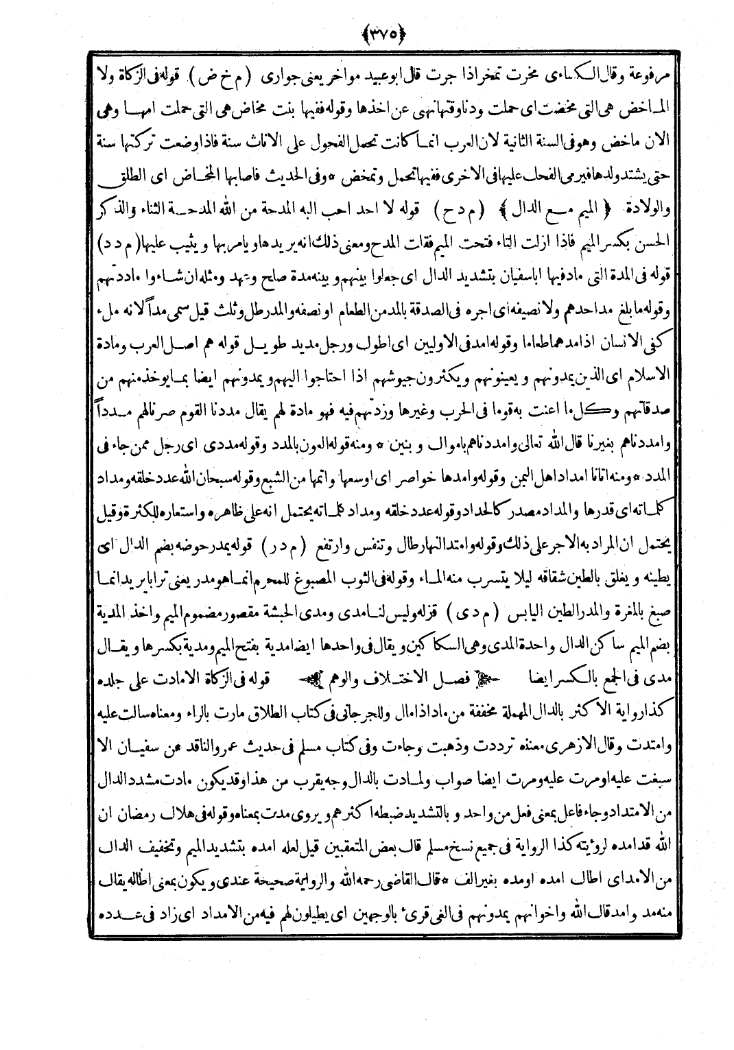 قَوْله فِي الزَّكَاة إِلَّا مادت على جلده كَذَا رِوَايَة الْأَكْثَر بِالدَّال الْمُهْملَة مُخَفّفَة من ماد إِذا مَال وللجرجاني فِي كتاب الطَّلَاق مارت بالبراء وَمَعْنَاهُ سَالَتْ عَلَيْهِ وامتدت وَقَالَ الْأَزْهَرِي معنذة ترددت وَذَهَبت وَجَاءَت وَفِي كتاب مُسلم فِي حَدِيث عمر والناقد عَن سُفْيَان إِلَّا سبغت عَلَيْهِ أَو مرت عَلَيْهِ وَمَرَّتْ أَيْضا صَوَاب ولمادت بِالدَّال وَجه يقرب من هَذَا وقدي يكون مادت مشدد الدَّال من الامتداد وَجَاء فَاعل بِمَعْنى فعل من وَاحِد وبالتشديد ضَبطه أَكْثَرهم ويروى مدت بِمَعْنَاهُ وَقَوله فِي هِلَال رَمَضَان أَن الله قد أمده لرُؤْيَته كَذَا الرِّوَايَة فِي جَمِيع نسخ مُسلم قَالَ بعض المتعقبين قيل لَعَلَّه أمده بتَشْديد الْمِيم وَتَخْفِيف الدَّال من الإمداي أَطَالَ أمده أَو مده بِغَيْر ألف