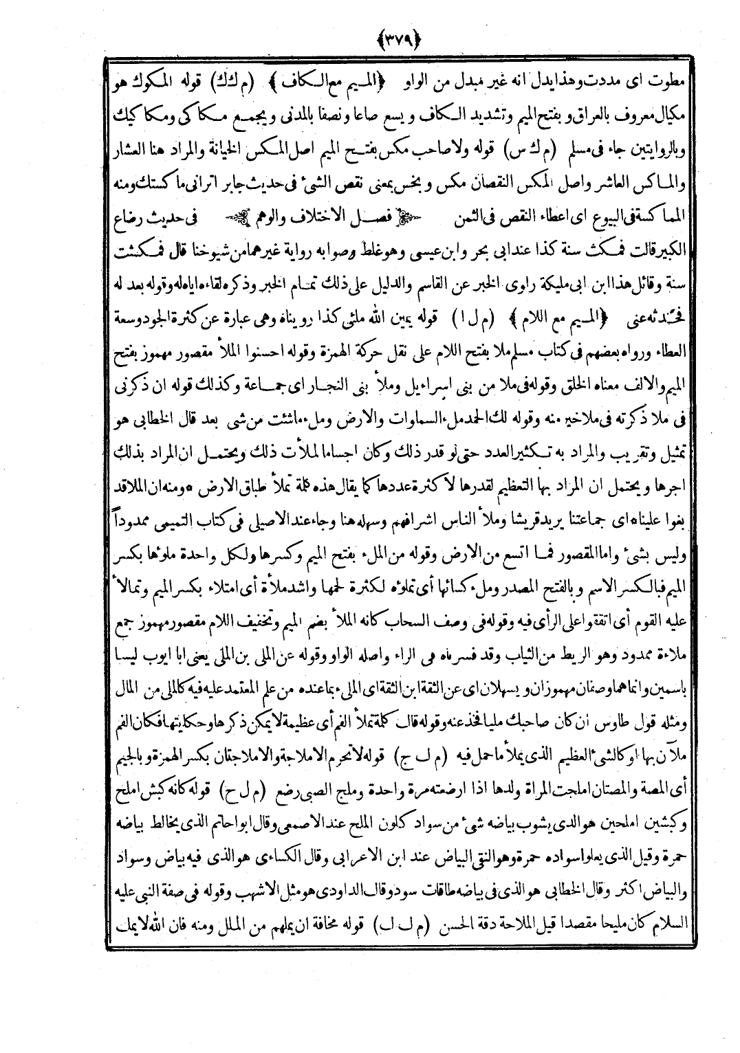 (وَمِنْه أَن الملاقد بغوا علينا) أَي جماعتنا يُرِيد قُريْشًا وملأ النَّاس أَشْرَافهم وسهله هُنَا وَجَاء عِنْد الْأصيلِيّ فِي كتاب التَّمِيمِي ممدودا وَلَيْسَ بِشَيْء وَأما الْمَقْصُور فَمَا اتَّسع من الأَرْض وَقَوله من الملء بِفَتْح الْمِيم وَكسرهَا وَلكُل وَاحِدَة ملؤُهَا بِكَسْر الْمِيم فبالكسر الِاسْم وبالفتح الْمصدر وملء كسائها أَي تملؤه لِكَثْرَة لَحمهَا وَأَشد ملأة أَي امتلاء بِكَسْر الْمِيم وتمالأ عَلَيْهِ الْقَوْم أَي اتَّفقُوا على الرَّأْي فِيهِ وَقَوله فِي وصف السَّحَاب كَأَنَّهُ الْمَلأ بِضَم الْمِيم وَتَخْفِيف اللَّام مَقْصُور مَهْمُوز جمع ملاءة مَمْدُود وَهُوَ الرَّبْط من الثِّيَاب وَقد فسرناه فِي يالراء وَأَصله الْوَاو وَقَوله عَن الملى بن الملى بن الملى يَعْنِي أَبَا أَيُّوب ليسَا باسمين وَإِنَّمَا هما وصفان مهموزان ويسهلان أَي عَن الثِّقَة ابْن الثِّقَة أَي الملئ بِمَا عِنْده من علم الْمُعْتَمد عَلَيْهِ فِيهِ كالملئ من المَال وَمثله قَول طَاوس إِن كَانَ صَاحبك مَلِيًّا فَخذ عَنهُ وَقَوله قَالَ كلمة تملأ الْفَم أَي عَظِيمَة لَا يُمكن ذكرهَا وحكايتها فَكَانَ الْفَم ملآن بهَا أَو كالشيء الْعَظِيم الَّذِي يمْلَأ مَا حمل فِيهِ