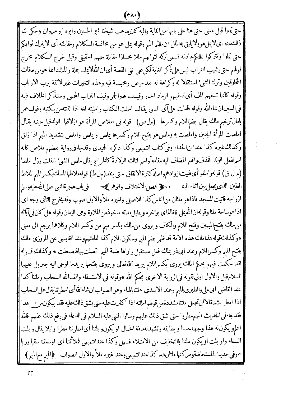 حَتَّى تملوا قيل معنى حَتَّى هُنَا على بَابهَا من الْغَايَة وَإِلَيْهِ كَانَ يذهب شَيخنَا أَبُو الْحُسَيْن وَأَبوهُ أَبُو مَرْوَان وَحكى لنا ذَلِك عَنهُ أَي لَا يمل هُوَ وَلَا يَلِيق بِهِ الْملَل إِن مللتم أَنْتُم وَقَوله يمل هُوَ من مجانسة الْكَلَام ومقابلته أَي لَا يتْرك ثوابكم حَتَّى تملوا وتتركوا بمللكم عِبَادَته فَسُمي تَركه لثوابهم مللا مجَازًا مُقَابلَة مللهم الْحَقِيقِيّ وَقيل خرج الْكَلَام مخرج قَوْلهم حَتَّى يشيب الْغُرَاب لَيْسَ على ذكر الْغَايَة لَكِن على نفي الْقِصَّة أَي أَن الله لَا يمل جملَة والملل إِنَّمَا هُوَ من صِفَات المخلوقين وَترك الشَّيْء استثقالا لَهُ وَكَرَاهَة لَهُ بعد حرص ومحبة فِيهِ وَهَذِه التغيرات غير لائقة بِرَبّ الأرباب وَقَوله كَأَنَّمَا تسفهم المل أَي تسفيهم الرماد الْحَار وَقيل هُوَ الْجَمْر وَقيل التُّرَاب المحمي وَسَنذكر الْخلاف فِيهِ فِي السِّين إِن شَاءَ الله وَقَوله فَأَمْلَتْ على آي السُّور يُقَال أمللت الْكتاب وأمليته لُغَة إِذا لقنته من يَكْتُبهُ وَقَول عمر يَا مَال ترخيم ملك يُقَال بِضَم اللَّام وَكسرهَا