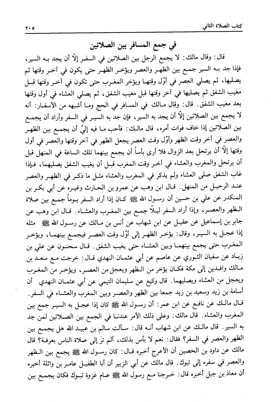 فِي جَمْعِ الْمُسَافِرِ بَيْنَ الصَّلَاتَيْنِ قَالَ: وَقَالَ مَالِكٌ: لَا يَجْمَعُ الرَّجُلُ بَيْنَ الصَّلَاتَيْنِ فِي السَّفَرِ إلَّا أَنْ يَجِدَّ بِهِ السَّيْرُ، فَإِذَا جَدَّ بِهِ السَّيْرُ جَمَعَ بَيْنَ الظُّهْرِ وَالْعَصْرِ وَيُؤَخِّرُ الظُّهْرَ حَتَّى يَكُونَ فِي آخِرِ وَقْتِهَا، ثُمَّ يُصَلِّيهَا، ثُمَّ يُصَلِّي الْعَصْرَ فِي أَوَّلِ وَقْتِهَا وَيُؤَخِّرُ الْمَغْرِبَ حَتَّى تَكُونَ فِي آخِرِ وَقْتِهَا قَبْلَ مَغِيبِ الشَّفَقِ، ثُمَّ يُصَلِّيهَا فِي آخِرِ وَقْتِهَا قَبْلَ مَغِيبِ الشَّفَقِ، ثُمَّ يُصَلِّي الْعِشَاءَ فِي أَوَّلِ وَقْتِهَا بَعْدَ مَغِيبِ الشَّفَقِ.