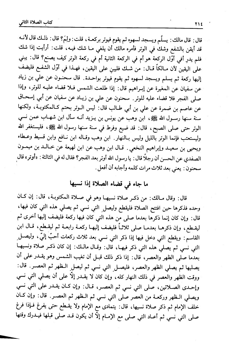 قَالَ سَحْنُونٌ عَنْ عَلِيِّ بْنِ زِيَادٍ عَنْ سُفْيَانَ عَنْ الْمُغِيرَةِ عَنْ إبْرَاهِيمَ قَالَ: إذَا طَلَعَتْ الشَّمْسُ فَلَا قَضَاءَ عَلَيْهِ لِلْوِتْرِ، وَإِذَا صَلَّى الْفَجْرَ فَلَا قَضَاءَ عَلَيْهِ لِلْوِتْرِ سَحْنُونٌ عَنْ عَلِيِّ بْنِ زِيَادٍ عَنْ سُفْيَانَ عَنْ أَبِي إِسْحَاقَ عَنْ عَاصِمِ بْنِ ضَمْرَةَ عَنْ عَلِيِّ بْنِ أَبِي طَالِبٍ قَالَ: «لَيْسَ الْوِتْرُ بِحَتْمٍ كَالْمَكْتُوبَةِ، وَلَكِنَّهَا سُنَّةٌ سَنَّهَا رَسُولُ اللَّهِ» ابْنُ وَهْبٍ عَنْ يُونُسَ بْنِ يَزِيدَ أَنَّهُ سَأَلَ ابْنَ شِهَابٍ عَمَّنْ نَسِيَ الْوِتْرَ حَتَّى صَلَّى الصُّبْحَ، قَالَ: قَدْ ضَيَّعَ وَفَرَّطَ فِي سُنَّةٍ سَنَّهَا رَسُولُ اللَّهِ - صَلَّى اللَّهُ عَلَيْهِ وَسَلَّمَ -، فَلْيَسْتَغْفِرْ اللَّهَ وَلْيَسْتَعْتِبْ فَإِنَّمَا الْوِتْرُ بِاللَّيْلِ وَلَيْسَ بِالنَّهَارِ ابْنُ وَهْبٍ وَقَالَهُ ابْنُ نَافِعٍ وَابْنُ قُسَيْطٍ وَعَطَاءٌ وَيَحْيَى بْنُ سَعِيدٍ وَإِبْرَاهِيمُ النَّخَعِيُّ.