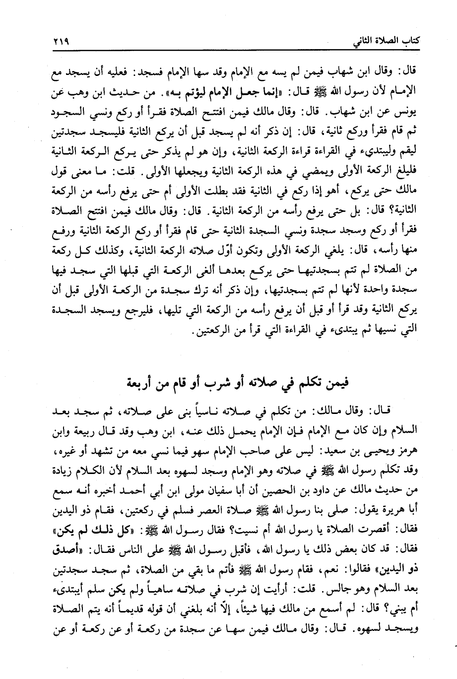 فِيمَنْ تَكَلَّمَ فِي صَلَاتِهِ أَوْ شَرِبَ أَوْ قَامَ مِنْ أَرْبَعَةٍ قَالَ: وَقَالَ مَالِكٌ: مَنْ تَكَلَّمَ فِي صَلَاتِهِ نَاسِيًا بَنَى عَلَى صَلَاتِهِ، ثُمَّ سَجَدَ بَعْدَ السَّلَامِ وَإِنْ كَانَ مَعَ الْإِمَامِ فَإِنَّ الْإِمَامَ يَحْمِلُ ذَلِكَ عَنْهُ ابْنُ وَهْبٍ. وَقَدْ قَالَ رَبِيعَةُ وَابْنُ هُرْمُزَ وَيَحْيَى بْنُ سَعِيدٍ: لَيْسَ عَلَى صَاحِبِ الْإِمَامِ سَهْوٌ فِيمَا نَسِيَ مَعَهُ مِنْ تَشَهُّدٍ أَوْ غَيْرِهِ، وَقَدْ تَكَلَّمَ رَسُولُ اللَّهِ - صَلَّى اللَّهُ عَلَيْهِ وَسَلَّمَ - فِي صَلَاتِهِ وَهُوَ الْإِمَامُ وَسَجَدَ لِسَهْوِهِ بَعْدَ السَّلَامِ؛ لِأَنَّ الْكَلَامَ زِيَادَةٌ مِنْ حَدِيثِ مَالِكٍ عَنْ دَاوُد بْنِ الْحُصَيْنِ أَنَّ أَبَا سُفْيَانَ مَوْلَى ابْنِ أَبِي أَحْمَدَ أَخْبَرَهُ أَنَّهُ سَمِعَ أَبَا هُرَيْرَةَ يَقُولُ: «صَلَّى بِنَا رَسُولُ اللَّهِ - صَلَّى اللَّهُ عَلَيْهِ وَسَلَّمَ - صَلَاةَ الْعَصْرِ فَسَلَّمَ فِي رَكْعَتَيْنِ، فَقَامَ ذُو الْيَدَيْنِ فَقَالَ: أَقَصَرْتَ الصَّلَاةُ يَا رَسُولَ اللَّهِ أَمْ نَسِيتَ؟ فَقَالَ رَسُولُ اللَّهِ - صَلَّى اللَّهُ عَلَيْهِ وَسَلَّمَ -: كُلُّ ذَلِكَ لَمْ يَكُنْ فَقَالَ: قَدْ كَانَ بَعْضُ ذَلِكَ يَا رَسُولَ اللَّهِ، فَأَقْبَلَ رَسُولُ اللَّهِ - صَلَّى اللَّهُ عَلَيْهِ وَسَلَّمَ - عَلَى النَّاسِ فَقَالَ: أَصَدَقَ ذُو الْيَدَيْنِ فَقَالُوا: نَعَمْ، فَقَامَ رَسُولُ اللَّهِ - صَلَّى اللَّهُ عَلَيْهِ وَسَلَّمَ - فَأَتَمَّ مَا بَقِيَ مِنْ الصَّلَاةِ، ثُمَّ سَجَدَ سَجْدَتَيْنِ بَعْدَ السَّلَامِ وَهُوَ جَالِسٌ» .