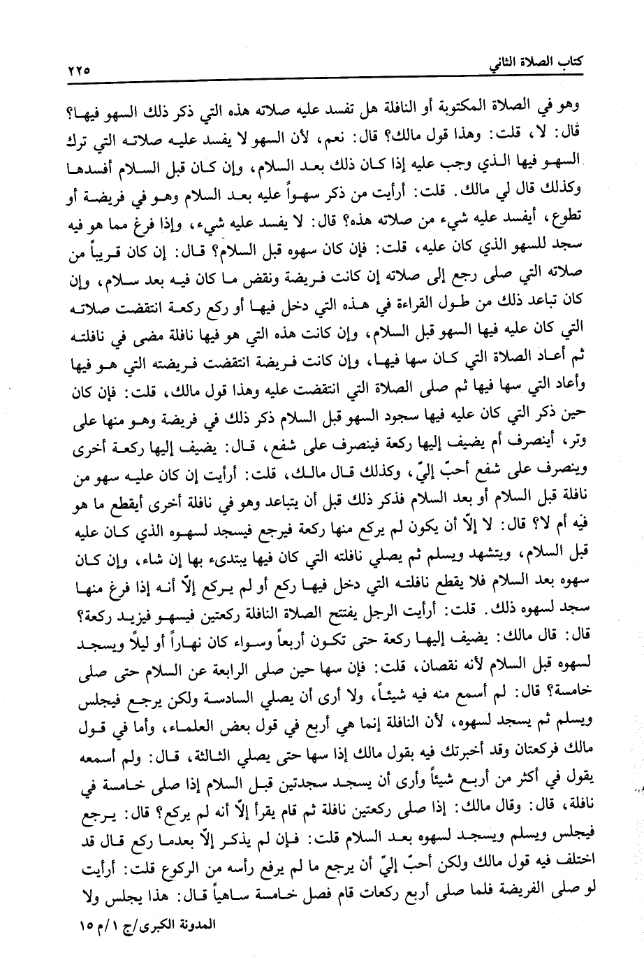 قُلْتُ: أَرَأَيْتَ إنْ كَانَ عَلَيْهِ سَهْوٌ مِنْ نَافِلَةٍ قَبْلَ السَّلَامِ أَوْ بَعْدَ السَّلَامِ فَذَكَرَ ذَلِكَ قَبْلَ أَنْ يَتَبَاعَدَ وَهُوَ فِي نَافِلَةٍ أُخْرَى أَيَقْطَعُ مَا هُوَ فِيهِ أَمْ لَا؟