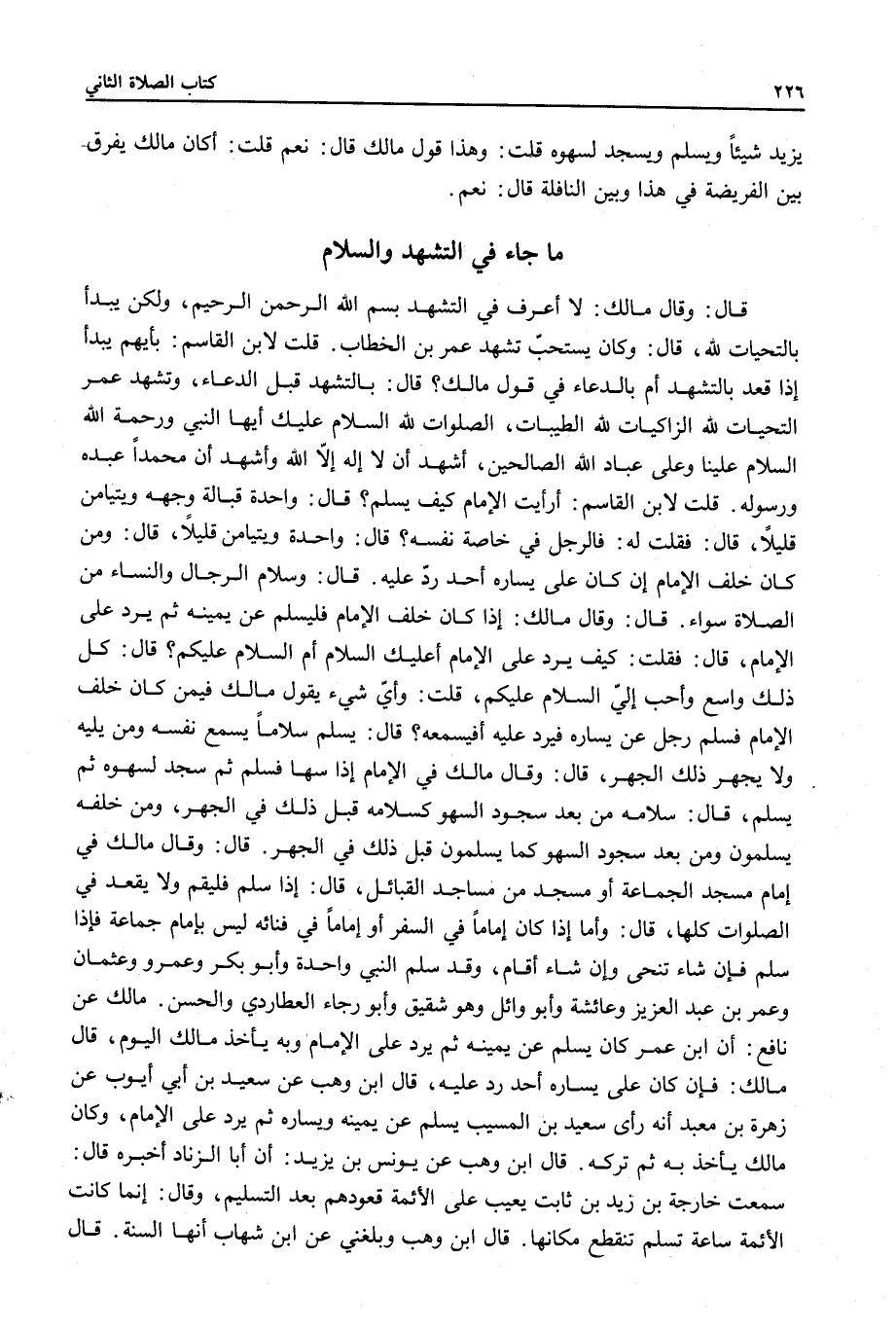 مَا جَاءَ فِي التَّشَهُّدِ وَالسَّلَامِ قَالَ: وَقَالَ مَالِكٌ: لَا أَعْرِفُ فِي التَّشَهُّدِ بِسْمِ اللَّهِ الرَّحْمَنِ الرَّحِيمِ، وَلَكِنْ يُبْدَأُ بِالتَّحِيَّاتِ لِلَّهِ، قَالَ: وَكَانَ يَسْتَحِبُّ تَشَهُّدَ عُمَرَ بْنِ الْخَطَّابِ. قُلْتُ لِابْنِ الْقَاسِمِ: بِأَيِّهِمْ يَبْدَأُ إذَا قَعَدَ بِالتَّشَهُّدِ أَمْ بِالدُّعَاءِ فِي قَوْلِ مَالِكٍ؟ قَالَ: بِالتَّشَهُّدِ قَبْلَ الدُّعَاءِ، وَتَشَهُّدُ عُمَرَ التَّحِيَّاتُ لِلَّهِ الزَّاكِيَاتُ لِلَّهِ الطَّيِّبَاتُ، الصَّلَوَاتُ لِلَّهِ السَّلَامُ عَلَيْكَ أَيُّهَا النَّبِيُّ وَرَحْمَةُ اللَّهِ، السَّلَامُ عَلَيْنَا وَعَلَى عِبَادِ اللَّهِ الصَّالِحِينَ، أَشْهَدُ أَنْ لَا إلَهَ إلَّا اللَّهَ وَأَشْهَدُ أَنَّ مُحَمَّدًا عَبْدُهُ وَرَسُولُهُ. قُلْت لِابْنِ الْقَاسِمِ: أَرَأَيْتَ الْإِمَامَ كَيْفَ يُسَلِّمُ؟