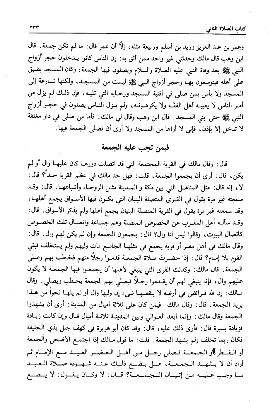 وَعُمَرَ بْنِ عَبْدِ الْعَزِيزِ وَزَيْدِ بْنِ أَسْلَمَ وَرَبِيعَةَ مِثْلَهُ، إلَّا أَنَّ عُمَرَ قَالَ: مَا لَمْ تَكُنْ جُمُعَةً. قَالَ ابْنُ وَهْبٍ قَالَ مَالِكٌ وَحَدَّثَنِي غَيْرُ وَاحِدٍ مِمَّنْ أَثِقُ بِهِ: أَنَّ النَّاسَ كَانُوا يَدْخُلُونَ حُجَرَ أَزْوَاجِ النَّبِيِّ - صَلَّى اللَّهُ عَلَيْهِ وَسَلَّمَ - بَعْدَ وَفَاةِ النَّبِيِّ - عَلَيْهِ الصَّلَاةُ وَالسَّلَامُ - وَيُصَلُّونَ فِيهَا الْجُمُعَةَ، وَكَانَ الْمَسْجِدُ يَضِيقُ عَلَى أَهْلِهِ فَيَتَوَسَّعُونَ بِهَا وَحُجَرُ أَزْوَاجِ النَّبِيِّ - صَلَّى اللَّهُ عَلَيْهِ وَسَلَّمَ - لَيْسَتْ مِنْ الْمَسْجِدِ، وَلَكِنَّهَا شَارِعَةٌ إلَى الْمَسْجِدِ وَلَا بَأْسَ بِمَنْ صَلَّى فِي أَفْنِيَةِ الْمَسْجِدِ وَرِحَابِهِ الَّتِي تَلِيهِ، فَإِنَّ ذَلِكَ لَمْ يَزَلْ مِنْ أَمْرِ النَّاسِ لَا يَعِيبُهُ أَهْلُ الْفِقْهِ وَلَا يَكْرَهُونَهُ، وَلَمْ يَزَلْ النَّاسُ يُصَلُّونَ فِي حُجَرِ أَزْوَاجِ النَّبِيِّ - صَلَّى اللَّهُ عَلَيْهِ وَسَلَّمَ - حَتَّى بُنِيَ الْمَسْجِدُ.