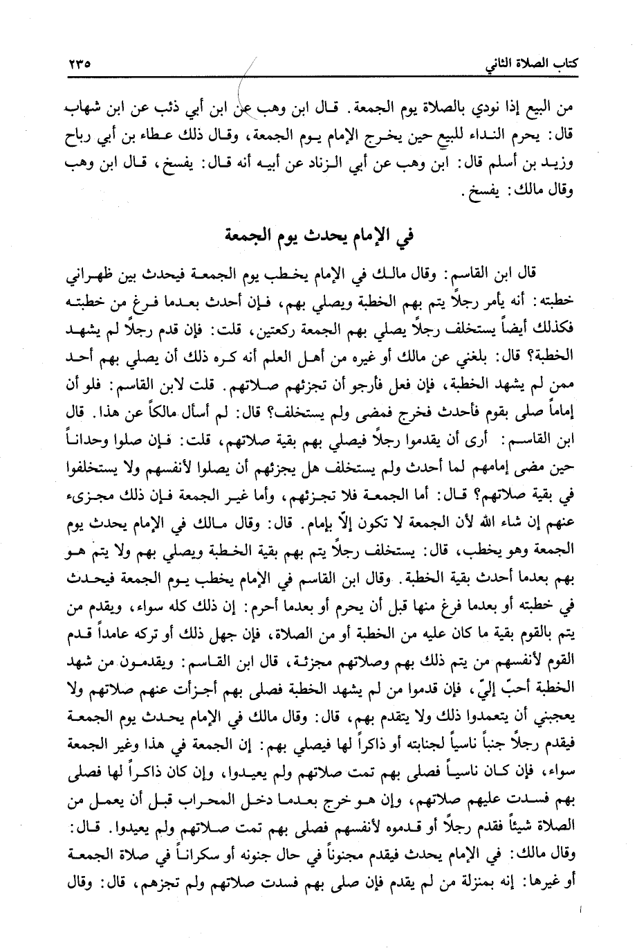 فِي الْإِمَامِ يُحْدِثُ يَوْمَ الْجُمُعَةِ قَالَ ابْنُ الْقَاسِمِ: وَقَالَ مَالِكٌ فِي الْإِمَامِ يَخْطُبُ يَوْمَ الْجُمُعَةِ فَيُحْدِثُ بَيْنَ ظَهْرَانِي خُطْبَتِهِ: أَنَّهُ يَأْمُرُ رَجُلًا يُتِمَّ بِهِمْ الْخُطْبَةَ وَيُصَلِّي بِهِمْ، فَإِنْ أَحْدَثَ بَعْدَمَا فَرَغَ مِنْ خُطْبَتِهِ فَكَذَلِكَ أَيْضًا يَسْتَخْلِفُ رَجُلًا يُصَلِّي بِهِمْ الْجُمُعَةَ رَكْعَتَيْنِ.