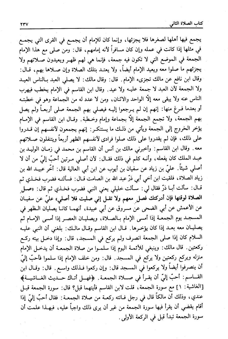 قَالَ: وَقَالَ ابْنُ الْقَاسِمِ: أَحَبُّ إلَيَّ أَنْ يَقْرَأَ فِي صَلَاةِ الْجُمُعَةِ {هَلْ أَتَاكَ حَدِيثُ الْغَاشِيَةِ} [الغاشية: 1] مَعَ سُورَةِ الْجُمُعَةِ.