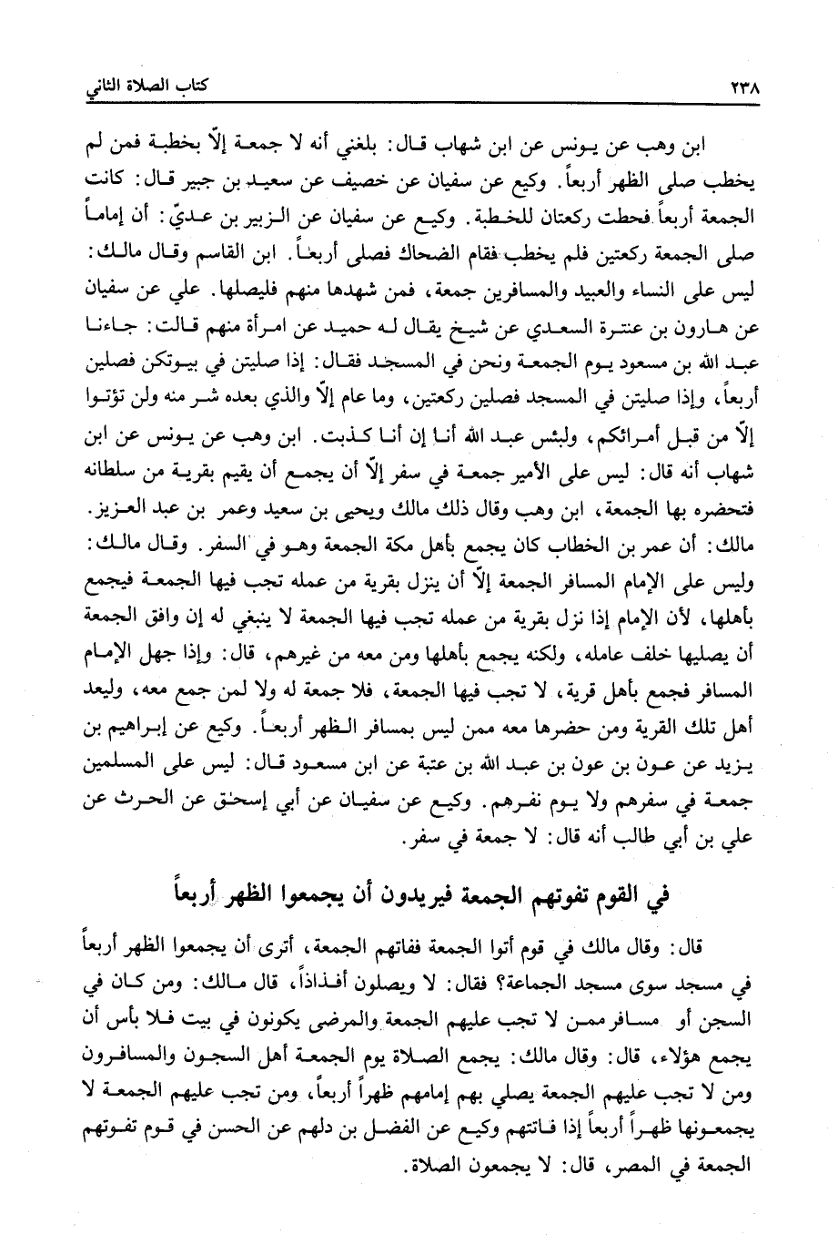 ابْنُ الْقَاسِمِ وَقَالَ مَالِكٌ: لَيْسَ عَلَى النِّسَاءِ وَالْعَبِيدِ وَالْمُسَافِرِينَ جُمُعَةٌ، فَمَنْ شَهِدَهَا مِنْهُمْ فَلْيُصَلِّهَا. عَلِيٌّ عَنْ سُفْيَانَ عَنْ هَارُونَ بْنِ عَنْتَرَةَ السَّعْدِيِّ عَنْ شَيْخٍ يُقَال لَهُ حُمَيْدٌ عَنْ امْرَأَةٍ مِنْهُمْ قَالَتْ: جَاءَنَا عَبْدُ اللَّهِ بْنُ مَسْعُودٍ يَوْمَ الْجُمُعَةِ وَنَحْنُ فِي الْمَسْجِدِ فَقَالَ: إذَا صَلَّيْتُنَّ فِي بُيُوتِكُنَّ فَصَلِّينَ أَرْبَعًا، وَإِذَا صَلَّيْتُنَّ فِي الْمَسْجِدِ فَصَلِّينَ رَكْعَتَيْنِ، وَمَا عَامٌ إلَّا وَاَلَّذِي بَعْدَهُ شَرٌّ مِنْهُ وَلَنْ تُؤْتَوْا إلَّا مِنْ قِبَلِ أُمَرَائِكُمْ، وَلَبِئْسَ عَبْدُ اللَّهِ أَنَا إنْ أَنَا كَذَبْتُ ابْنُ وَهْبٍ عَنْ يُونُسَ عَنْ ابْنِ شِهَابٍ أَنَّهُ قَالَ: لَيْسَ عَلَى الْأَمِيرِ جُمُعَةٌ فِي سَفَرٍ إلَّا أَنْ يُجَمِّعَ أَنْ يُقِيمَ بِقَرْيَةٍ مِنْ سُلْطَانِهِ فَتَحْضُرُهُ بِهَا الْجُمُعَةُ ابْنُ وَهْبٍ وَقَالَ ذَلِكَ مَالِكٌ وَيَحْيَى بْنُ سَعِيدٍ وَعُمَرُ بْنُ عَبْدِ الْعَزِيزِ. مَالِكٌ: أَنَّ عُمَرَ بْنَ الْخَطَّابِ كَانَ يُجَمِّعُ بِأَهْلِ مَكَّةَ الْجُمُعَةَ وَهُوَ فِي السَّفَرِ.