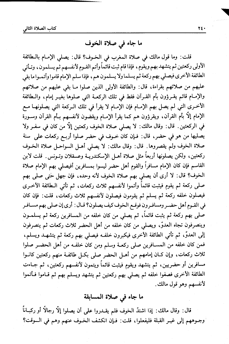 مَا جَاءَ فِي صَلَاةِ الْخَوْفِ قُلْتُ: وَمَا قَوْلُ مَالِكٍ فِي صَلَاةِ الْمَغْرِبِ فِي الْخَوْفِ؟ قَالَ: يُصَلِّي الْإِمَامُ بِالطَّائِفَةِ الْأُولَى رَكْعَتَيْنِ ثُمَّ يَتَشَهَّدُ بِهِمْ وَيَقُومُ، فَإِذَا قَامَ ثَبَتَ قَائِمًا وَأَتَمَّ الْقَوْمُ لِأَنْفُسِهِمْ ثُمَّ يُسَلِّمُونَ، وَتَأْتِي الطَّائِفَةُ الْأُخْرَى فَيُصَلِّي بِهِمْ رَكْعَةً ثُمَّ يُسَلِّمُ وَلَا يُسَلِّمُونَ هُمْ، فَإِذَا سَلَّمَ الْإِمَامُ قَامُوا وَأَتَمُّوا مَا بَقِيَ عَلَيْهِمْ مِنْ صَلَاتِهِمْ بِقِرَاءَةٍ، قَالَ: وَالطَّائِفَةُ الْأُولَى الَّذِينَ صَلَّوْا مَا بَقِيَ عَلَيْهِمْ مِنْ صَلَاتِهِمْ وَالْإِمَامُ قَائِمٌ يَقْرَءُونَ بِأُمِّ الْقُرْآنِ فَقَطْ فِي تِلْكَ الرَّكْعَةِ الَّتِي صَلَّوْهَا بِغَيْرِ إمَامٍ، وَالطَّائِفَةُ الْأُخْرَى الَّتِي لَمْ يُصَلِّ بِهِمْ الْإِمَامُ فَإِنَّ الْإِمَامَ لَا يَقْرَأُ فِي تِلْكَ الرَّكْعَةِ الَّتِي يُصَلُّونَهَا مَعَ الْإِمَامِ إلَّا بِأُمِّ الْقُرْآنِ، وَيَقْرَءُونَ هُمْ كَمَا يَقْرَأُ الْإِمَامُ وَيَقْضُونَ لِأَنْفُسِهِمْ بِأُمِّ الْقُرْآنِ وَسُورَةٍ فِي الرَّكْعَتَيْنِ.
