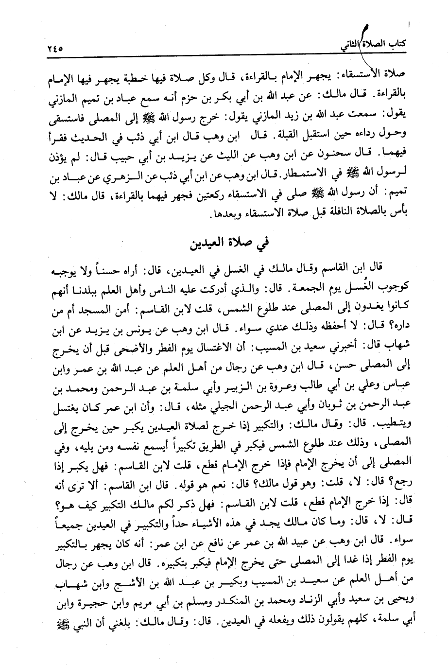 مَا جَاءَ فِي صَلَاةِ الْعِيدَيْنِ قَالَ ابْنُ الْقَاسِمِ وَقَالَ مَالِكٌ فِي الْغُسْلِ فِي الْعِيدَيْنِ، قَالَ أَرَاهُ حَسَنًا وَلَا يُوجِبُهُ كَوُجُوبِ الْغُسْلِ يَوْمَ الْجُمُعَةِ. قَالَ: وَاَلَّذِي أَدْرَكْتُ عَلَيْهِ النَّاسَ وَأَهْلَ الْعِلْمِ بِبَلَدِنَا أَنَّهُمْ كَانُوا يَغْدُونَ إلَى الْمُصَلَّى عِنْدَ طُلُوعِ الشَّمْسِ.
