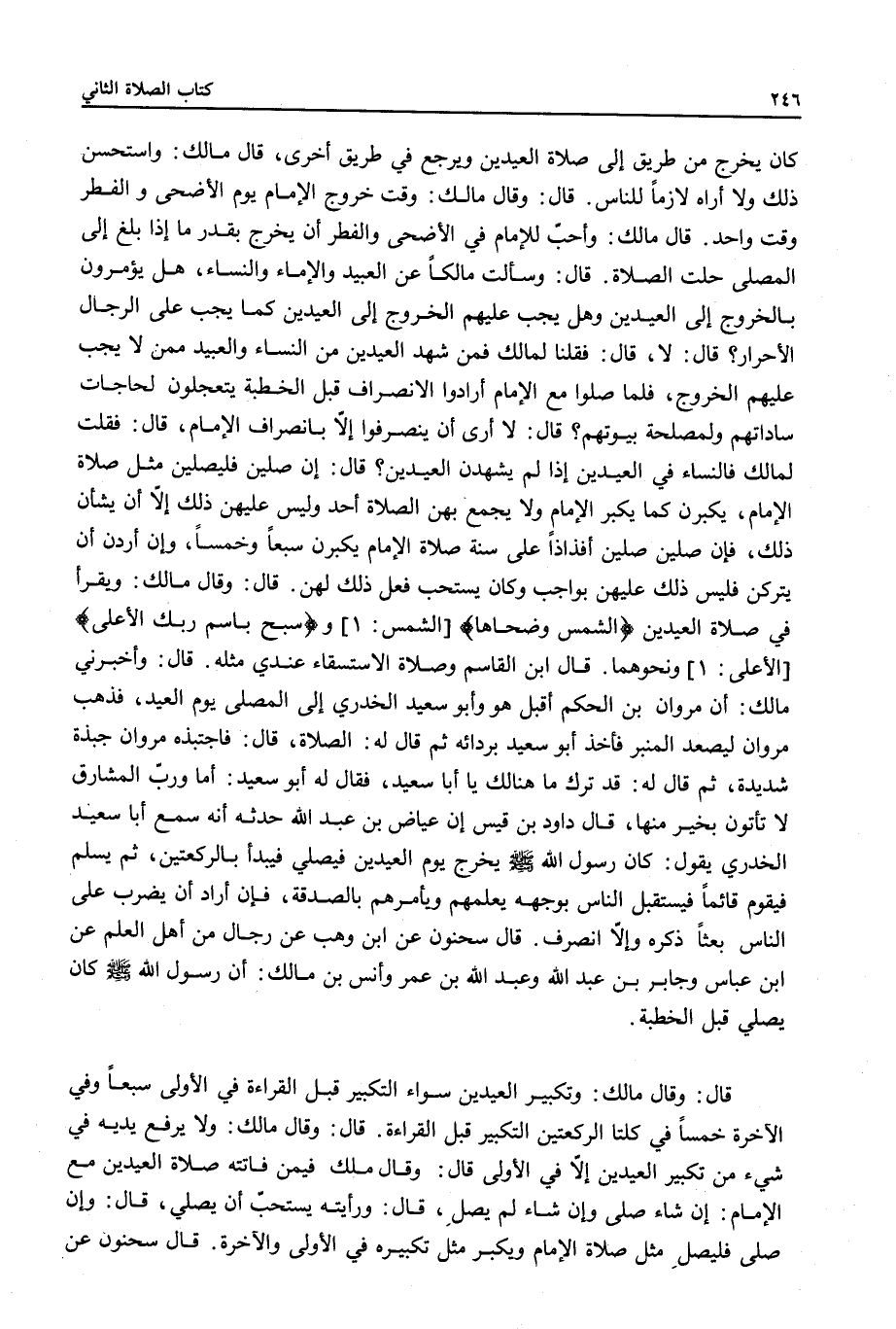 قَالَ سَحْنُونٌ عَنْ ابْنِ وَهْبٍ عَنْ رِجَالٍ مِنْ أَهْلِ الْعِلْمِ عَنْ ابْنِ عَبَّاسٍ وَجَابِرِ بْنِ عَبْدِ اللَّهِ وَعَبْدِ اللَّهِ بْنِ عُمَرَ وَأَنَسِ بْنِ مَالِكٍ: «أَنَّ رَسُولَ اللَّهِ - صَلَّى اللَّهُ عَلَيْهِ وَسَلَّمَ - كَانَ يُصَلِّي قَبْلَ الْخُطْبَةِ» .