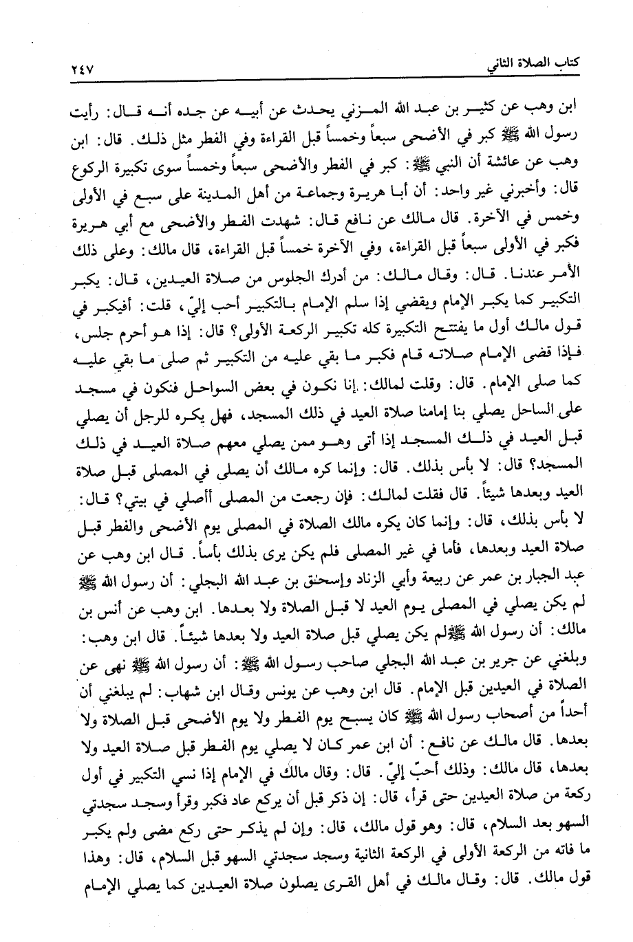 قَالَ: لَا بَأْسَ بِذَلِكَ، قَالَ: وَإِنَّمَا كَانَ يَكْرَهُ مَالِكٌ الصَّلَاةَ فِي الْمُصَلَّى يَوْمَ الْأَضْحَى وَالْفِطْرِ قَبْلَ صَلَاةِ الْعِيدِ وَبَعْدَهَا، فَأَمَّا فِي غَيْرِ الْمُصَلَّى فَلَمْ يَكُنْ يَرَى بِذَلِكَ بَأْسًا قَالَ ابْنُ وَهْبٍ عَنْ عَبْدِ الْجَبَّارِ بْنِ عُمَرَ عَنْ رَبِيعَةَ وَأَبِي الزِّنَادِ وَإِسْحَاقَ بْنِ عَبْدِ اللَّهِ الْبَجَلِيِّ: «أَنَّ رَسُولَ اللَّهِ - صَلَّى اللَّهُ عَلَيْهِ وَسَلَّمَ - لَمْ يَكُنْ يُصَلِّي فِي الْمُصَلَّى يَوْمَ الْعِيدِ لَا قَبْلَ الصَّلَاةِ وَلَا بَعْدَهَا» ابْنُ وَهْبٍ عَنْ أَنَسِ بْنِ مَالِكٍ: «أَنَّ رَسُولَ اللَّهِ - صَلَّى اللَّهُ عَلَيْهِ وَسَلَّمَ - لَمْ يَكُنْ يُصَلِّي قَبْلَ صَلَاةِ الْعِيدِ وَلَا بَعْدَهَا شَيْئًا» .