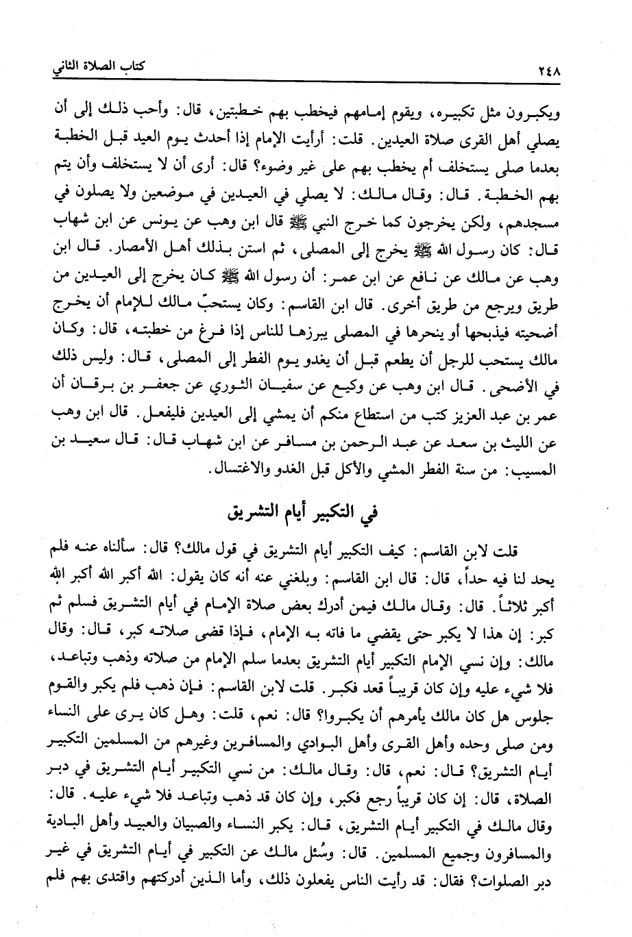 قَالَ: وَسُئِلَ مَالِكٌ عَنْ التَّكْبِيرِ فِي أَيَّامِ التَّشْرِيقِ فِي غَيْرِ دُبُرِ الصَّلَوَاتِ؟ فَقَالَ: قَدْ رَأَيْتُ النَّاسَ يَفْعَلُونَ ذَلِكَ، وَأَمَّا الَّذِينَ أَدْرَكْتَهُمْ وَاقْتَدِي بِهِمْ فَلَمْ