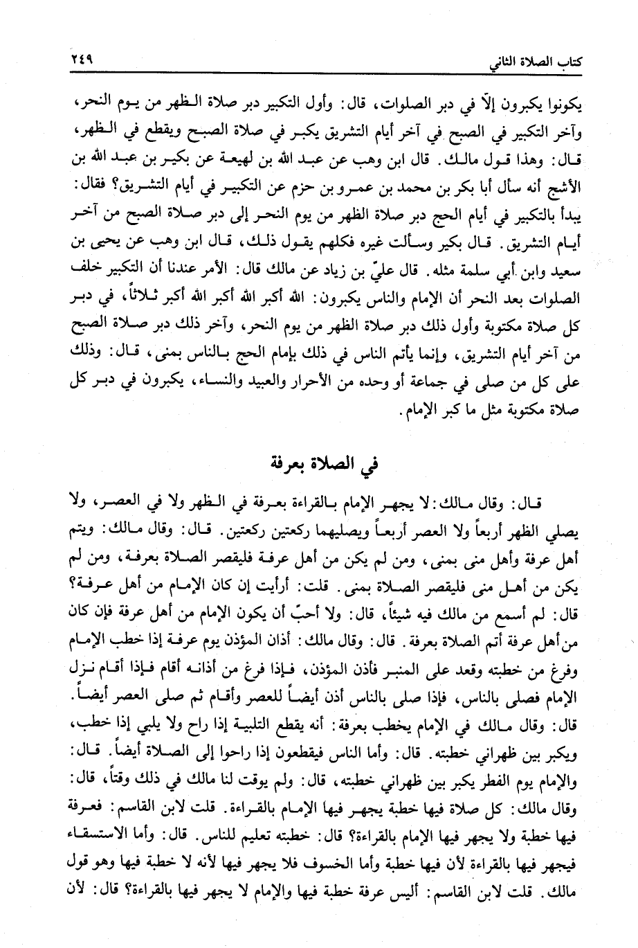 قُلْتُ لِابْنِ الْقَاسِمِ: فَعَرَفَةُ فِيهَا خُطْبَةٌ وَلَا يَجْهَرُ فِيهَا الْإِمَامُ بِالْقِرَاءَةِ؟
