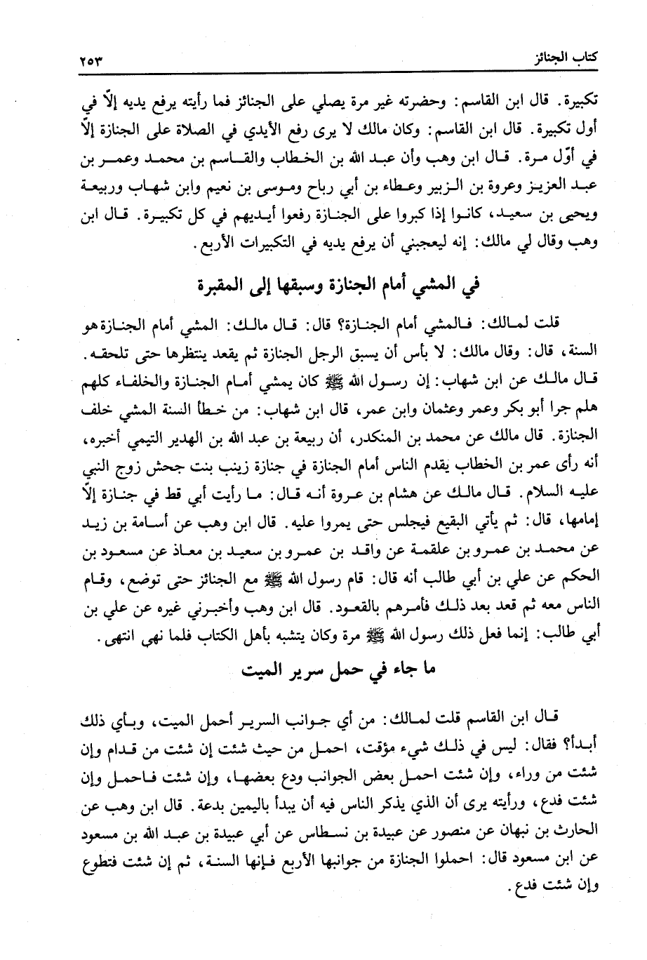 قَالَ مَالِكٌ عَنْ ابْنِ شِهَابٍ: «إنَّ رَسُولَ اللَّهِ - صَلَّى اللَّهُ عَلَيْهِ وَسَلَّمَ - كَانَ يَمْشِي أَمَامَ الْجِنَازَةِ وَالْخُلَفَاءُ كُلُّهُمْ هَلُمَّ جَرًّا أَبُو بَكْرٍ وَعُمَرُ وَعُثْمَانُ وَابْنُ عُمَرَ» ، قَالَ ابْنُ شِهَابٍ: مِنْ خَطَإِ السُّنَّةِ الْمَشْيُ خَلْفَ الْجِنَازَةِ.