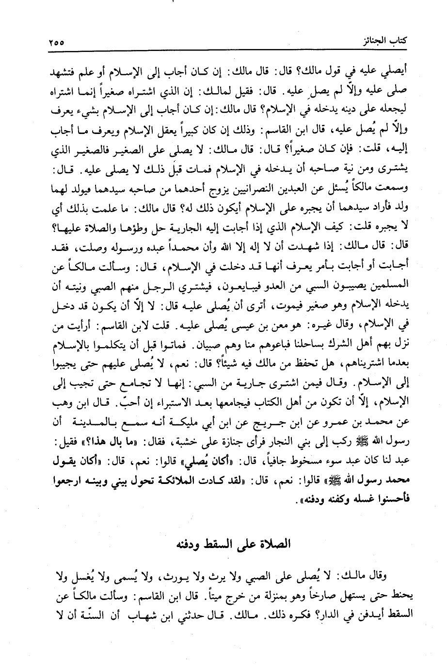 قَالَ: وَسَأَلْتُ مَالِكًا عَنْ الْمُسْلِمِينَ يُصِيبُونَ السَّبْيَ مِنْ الْعَدُوِّ فَيُبَايِعُونَ، فَيَشْتَرِي الرَّجُلُ مِنْهُمْ الصَّبِيَّ وَنِيَّتُهُ أَنْ يُدْخِلَهُ الْإِسْلَامَ وَهُوَ صَغِيرٌ فَيَمُوتُ، أَتَرَى أَنْ يُصَلِّيَ عَلَيْهِ قَالَ: لَا إلَّا أَنْ يَكُونَ قَدْ دَخَلَ فِي الْإِسْلَامِ، وَقَالَ غَيْرُهُ: هُوَ مَعْنُ بْنُ عِيسَى يُصَلِّي عَلَيْهِ.