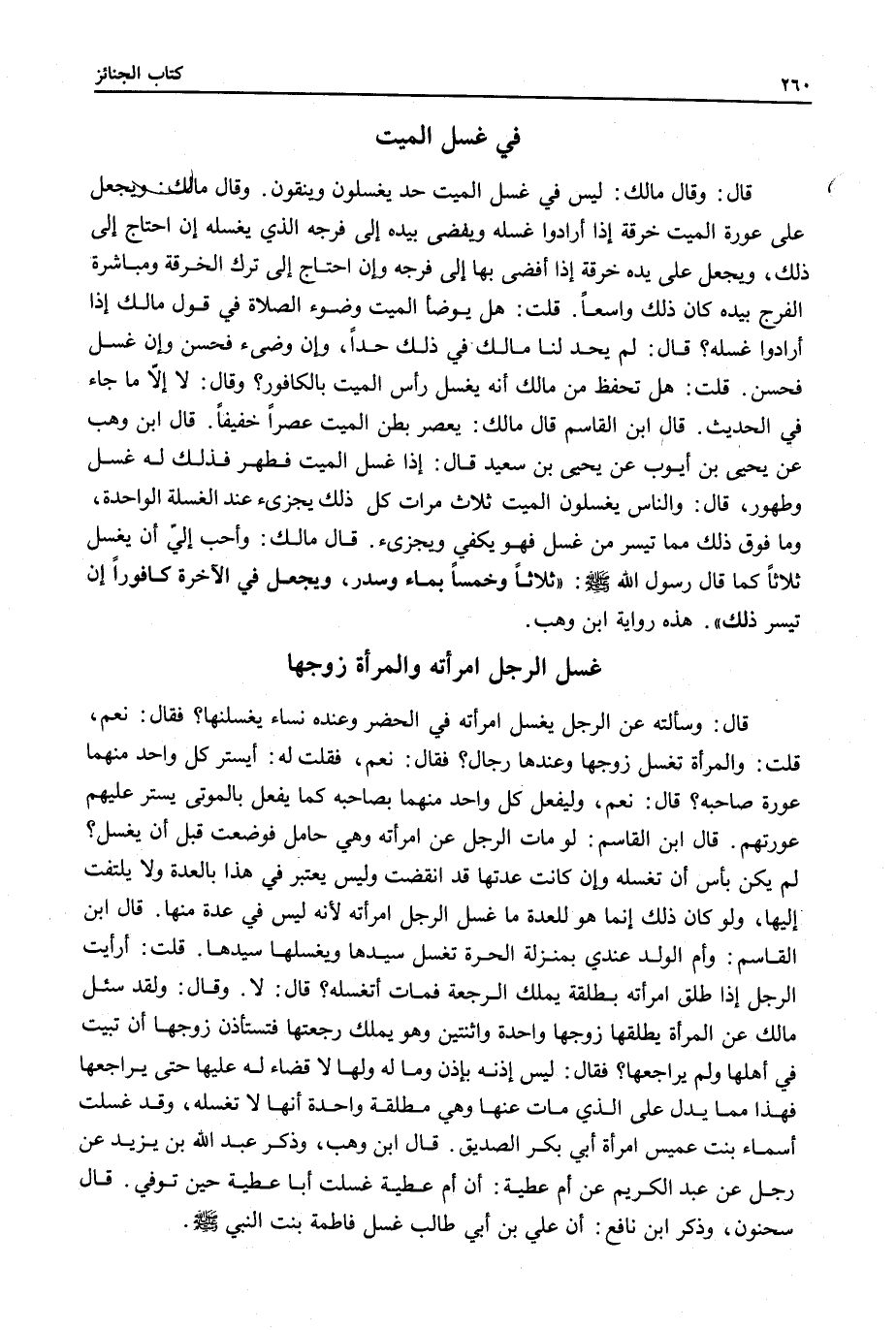 قَالَ سَحْنُونٌ، وَذَكَرَ ابْنُ نَافِعٍ: أَنَّ عَلِيَّ بْنَ أَبِي طَالِبٍ غَسَّلَ فَاطِمَةَ بِنْتَ النَّبِيِّ - صَلَّى اللَّهُ عَلَيْهِ وَسَلَّمَ -. .