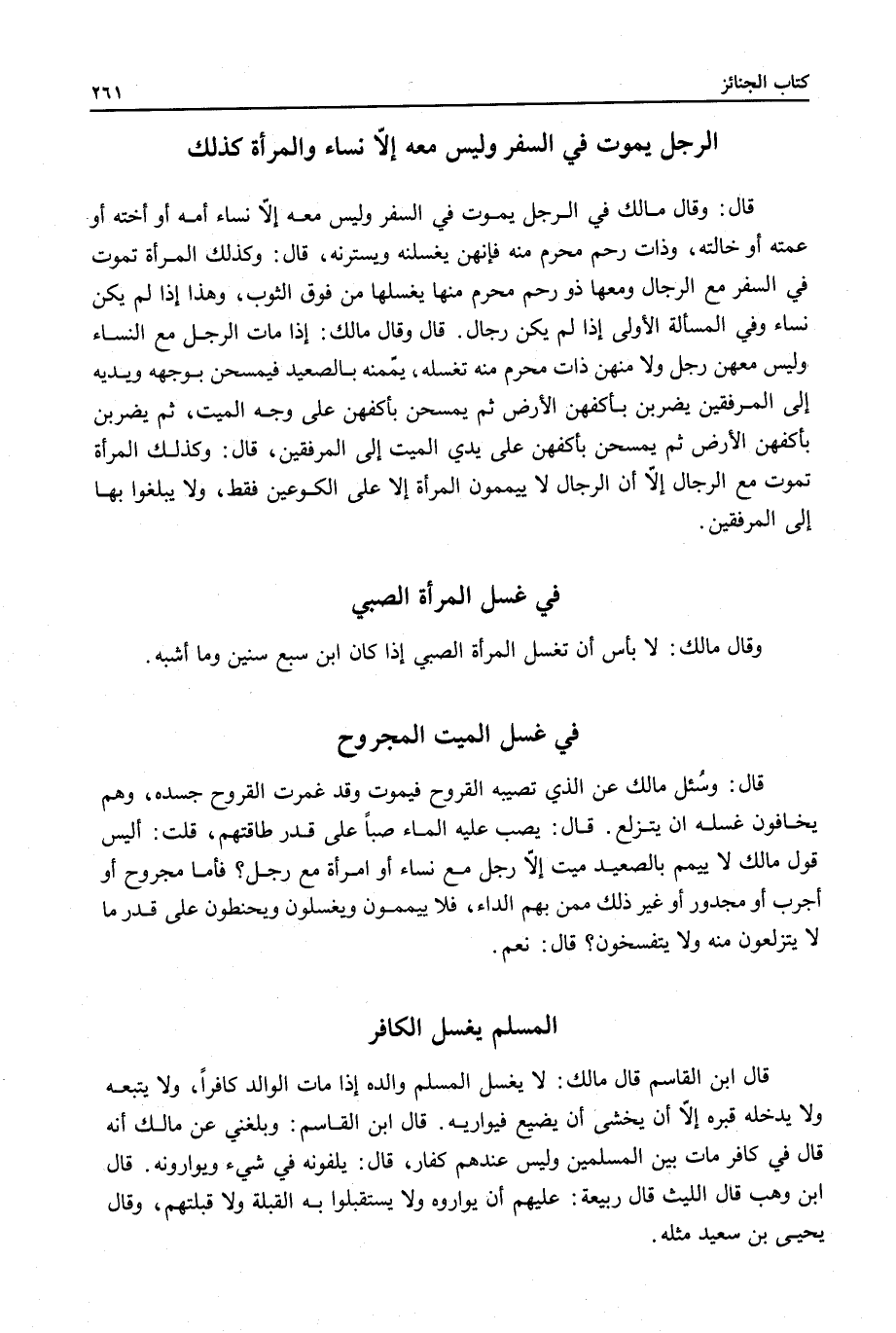 َ قَالَ: وَقَالَ مَالِكٌ فِي الرَّجُلِ يَمُوتُ فِي السَّفَرِ وَلَيْسَ مَعَهُ إلَّا نِسَاءٌ أُمُّهُ أَوْ أُخْتُهُ أَوْ عَمَّتُهُ أَوْ خَالَتَهُ، وَذَاتَ رَحِمٍ مَحْرَمٍ مِنْهُ فَإِنَّهُنَّ يُغَسِّلْنَهُ وَيَسْتُرْنَهُ، قَالَ: وَكَذَلِكَ الْمَرْأَةُ تَمُوتُ فِي السَّفَرِ مَعَ الرِّجَالِ وَمَعَهَا ذُو رَحِمٍ مَحْرَمٍ مِنْهَا يُغَسِّلُهَا مِنْ فَوْقِ الثَّوْبِ، وَهَذَا إذَا لَمْ يَكُنْ نِسَاءٌ وَفِي الْمَسْأَلَةِ الْأُولَى إذَا لَمْ يَكُنْ رِجَالٌ.