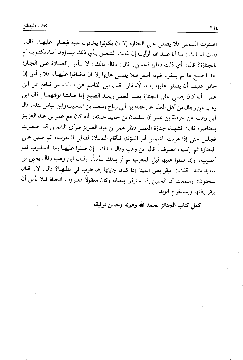 قَالَ ابْنُ وَهْبٍ عَنْ رِجَالٍ مِنْ أَهْلِ الْعِلْمِ عَنْ عَطَاءِ بْنِ أَبِي رَبَاحٍ وَسَعِيدِ بْنِ الْمُسَيِّبِ وَابْنِ عَبَّاسٍ مِثْلَهُ. قَالَ ابْنُ وَهْبٍ عَنْ حَرْمَلَةَ بْنِ عُمَرَ أَنْ سُلَيْمَانَ بْنَ حُمَيْدٍ حَدَّثَهُ، أَنَّهُ كَانَ مَعَ عُمَرَ بْنِ عَبْدِ الْعَزِيزِ بِخَنَاصِرَةَ قَالَ: فَشَهِدْنَا جِنَازَةَ الْعَصْرِ فَنَظَرَ عُمَرُ بْنُ عَبْدِ الْعَزِيزِ فَرَأَى الشَّمْسَ قَدْ اصْفَرَّتْ فَجَلَسَ حَتَّى إذَا غَرَبَتْ الشَّمْسُ أَمَرَ الْمُؤَذِّنَ فَأَقَامَ الصَّلَاةَ فَصَلَّى الْمَغْرِبَ، ثُمَّ صَلَّى عَلَى الْجِنَازَةِ ثُمَّ رَكِبَ وَانْصَرَفَ. قَالَ ابْنُ وَهْبٍ وَقَالَ مَالِكٌ: إنْ صَلَّوْا عَلَيْهَا بَعْدَ الْمَغْرِبِ فَهُوَ أَصْوَبُ، وَإِنْ صَلَّوْا عَلَيْهَا قَبْلَ الْمَغْرِبِ لَمْ أَرَ بِذَلِكَ بَأْسًا، وَقَالَ ابْنُ وَهْبٍ وَقَالَ يَحْيَى بْنُ سَعِيدٍ مِثْلَهُ. قُلْتُ: أَيُبْقَرُ بَطْنُ الْمَيْتَةِ إذَا كَانَ جَنِينُهَا يَضْطَرِبُ فِي بَطْنِهَا؟ قَالَ: لَا قَالَ سَحْنُونٌ: وَسَمِعْتُ أَنَّ الْجَنِينَ إذَا اسْتُوقِنَ بِحَيَاتِهِ وَكَانَ مَعْقُولًا مَعْرُوفَ الْحَيَاةِ فَلَا بَأْسَ أَنْ يُبْقَرَ بَطْنُهَا وَيُسْتَخْرَجَ الْوَلَدُ.