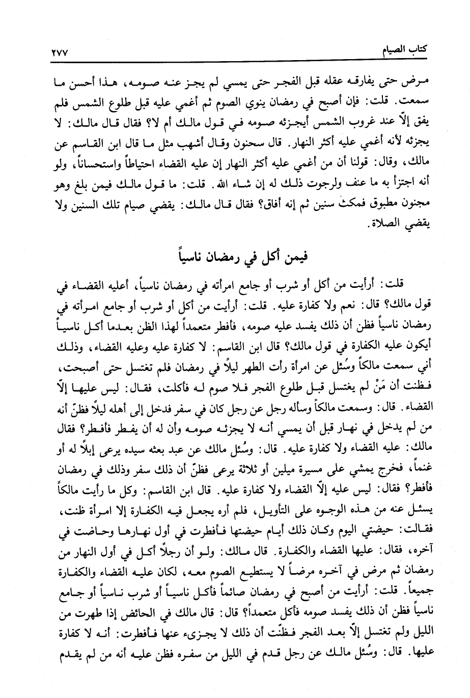 فِيمَنْ أَكَلَ فِي رَمَضَانَ نَاسِيًا قُلْتُ: أَرَأَيْتَ مَنْ أَكَلَ أَوْ شَرِبَ أَوْ جَامَعَ امْرَأَتَهُ فِي رَمَضَانَ نَاسِيًا، أَعَلَيْهِ الْقَضَاءُ فِي قَوْلِ مَالِكٍ؟
