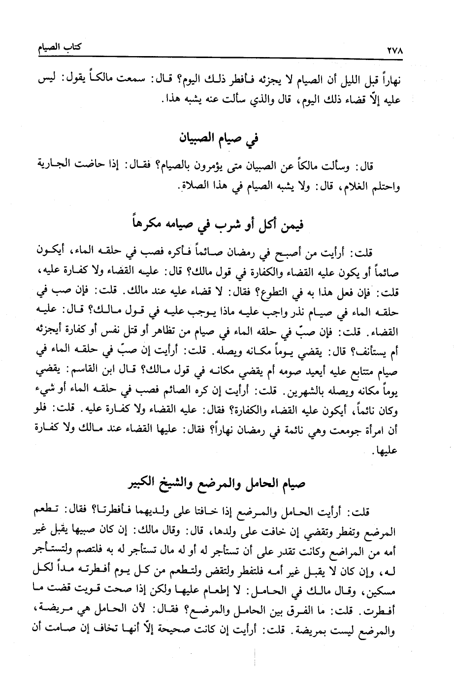 فِي صِيَامِ الصِّبْيَانِ قَالَ: وَسَأَلْتُ مَالِكًا عَنْ الصِّبْيَانِ مَتَى يُؤْمَرُونَ بِالصِّيَامِ؟ فَقَالَ: إذَا حَاضَتْ الْجَارِيَةُ وَاحْتَلَمَ الْغُلَامُ، قَالَ: وَلَا يُشْبِهُ الصِّيَامُ فِي هَذَا الصَّلَاةَ.
