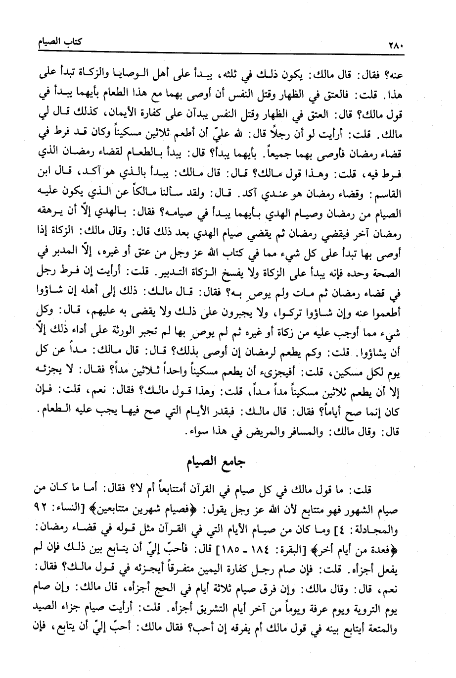 ِ قُلْتُ: مَا قَوْلُ مَالِكٍ فِي كُلِّ صِيَامٍ فِي الْقُرْآنِ أَمُتَتَابِعًا أَمْ لَا؟ فَقَالَ: أَمَّا مَا كَانَ مِنْ صِيَامِ الشُّهُورِ فَهُوَ مُتَتَابِعٌ؛ لِأَنَّ اللَّهَ عَزَّ وَجَلَّ يَقُولُ: {فَصِيَامُ شَهْرَيْنِ مُتَتَابِعَيْنِ} [المجادلة: 4] وَمَا كَانَ مِنْ صِيَامِ الْأَيَّامِ الَّتِي فِي الْقُرْآنِ مِثْلُ قَوْلِهِ فِي قَضَاءِ رَمَضَانَ: {فَعِدَّةٌ مِنْ أَيَّامٍ أُخَرَ} [البقرة: 184] قَالَ: فَأَحَبُّ إلَيَّ أَنْ يُتَابِعَ بَيْنَ ذَلِكَ فَإِنْ لَمْ يَفْعَلْ أَجْزَأَهُ.