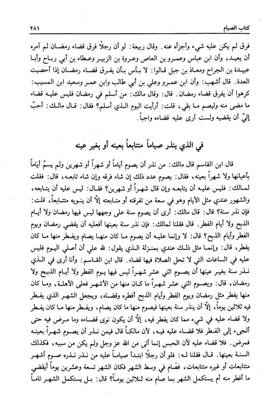 قَالَ ابْنُ الْقَاسِمِ قَالَ مَالِكٌ: مَنْ نَذَرَ أَنْ يَصُومَ أَيَّامًا أَوْ شَهْرًا أَوْ شَهْرَيْنِ وَلَمْ يُسَمِّ أَيَّامًا بِأَعْيَانِهَا وَلَا شَهْرًا بِعَيْنِهِ، فَقَالَ: يَصُومُ عَدَدَ ذَلِكَ إنْ شَاءَ فَرَّقَهُ وَإِنْ شَاءَ تَابَعَهُ، قَالَ: فَقُلْتُ لِمَالِكٍ: فَلَيْسَ عَلَيْهِ أَنْ يُتَابِعَهُ وَإِنْ قَالَ شَهْرًا أَوْ شَهْرَيْنِ؟ فَقَالَ: لَيْسَ عَلَيْهِ أَنْ يُتَابِعَهُ، وَالشُّهُورُ عِنْدِي مِثْلُ الْأَيَّامِ وَهُوَ فِي سَعَةٍ مِنْ تَفْرِقَتِهِ أَوْ مُتَابَعَتِهِ إلَّا أَنْ يَنْوِيَهُ مُتَتَابِعًا.