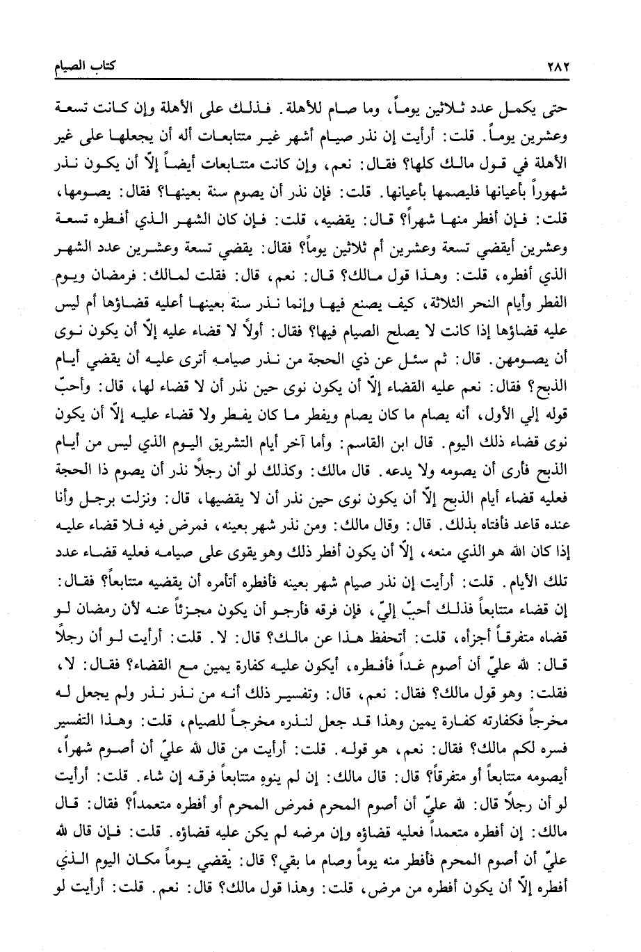 قَالَ: نَعَمْ، قَالَ: فَقُلْتُ لِمَالِكٍ: فَرَمَضَانُ وَيَوْمُ الْفِطْرِ وَأَيَّامُ النَّحْرِ الثَّلَاثَةُ، كَيْفَ يَصْنَعُ فِيهَا وَإِنَّمَا نَذَرَ سَنَةً بِعَيْنِهَا أَعَلَيْهِ قَضَاؤُهَا أَمْ لَيْسَ عَلَيْهِ قَضَاؤُهَا إذَا كَانَتْ لَا يَصْلُحُ الصِّيَامُ فِيهَا؟ فَقَالَ: أَوَّلًا لَا قَضَاءَ عَلَيْهِ إلَّا أَنْ يَكُونَ نَوَى أَنْ يَصُومَهُنَّ.
