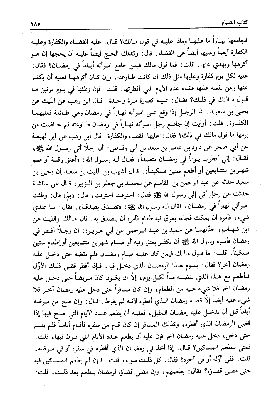 قَالَ مَالِكٌ وَاللَّيْثُ عَنْ ابْنِ شِهَابٍ، حَدَّثَهُمَا عَنْ حُمَيْدِ بْنِ عَبْدِ الرَّحْمَنِ عَنْ أَبِي هُرَيْرَةَ: «أَنَّ رَجُلًا أَفْطَرَ فِي رَمَضَانَ فَأَمَرَهُ رَسُولُ اللَّهِ - صَلَّى اللَّهُ عَلَيْهِ وَسَلَّمَ - أَنْ يُكَفِّرَ بِعِتْقِ رَقَبَةٍ أَوْ صِيَامِ شَهْرَيْنِ مُتَتَابِعَيْنِ أَوْ إطْعَامِ سِتِّينَ مِسْكِينًا» .