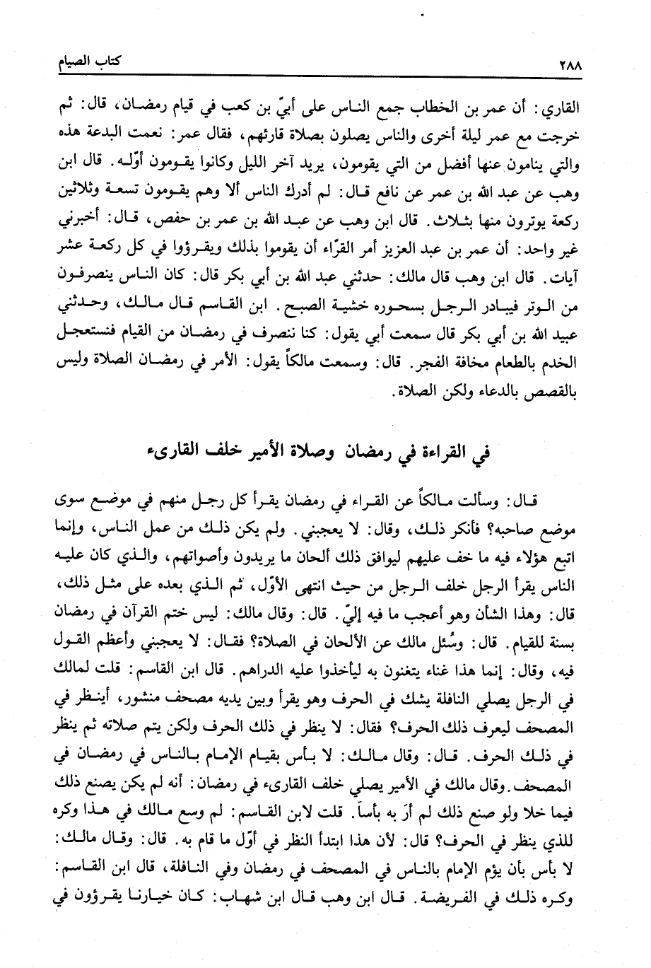 فِي الْقِرَاءَةِ فِي رَمَضَانَ وَصَلَاةُ الْأَمِيرِ خَلْفَ الْقَارِئِ قَالَ: وَسَأَلْتُ مَالِكًا عَنْ الْقُرَّاءِ فِي رَمَضَانَ يَقْرَأُ كُلُّ رَجُلٍ مِنْهُمْ فِي مَوْضِعٍ سِوَى مَوْضِعِ صَاحِبِهِ؟ فَأَنْكَرَ ذَلِكَ، وَقَالَ: لَا يُعْجِبُنِي. وَلَمْ يَكُنْ ذَلِكَ مِنْ عَمَلِ النَّاسِ، وَإِنَّمَا اتَّبَعَ هَؤُلَاءِ فِيهِ مَا خَفَّ عَلَيْهِمْ لِيُوَافِقَ ذَلِكَ أَلْحَانَ مَا يُرِيدُونَ وَأَصْوَاتَهُمْ، وَاَلَّذِي كَانَ عَلَيْهِ النَّاسُ يَقْرَأُ الرَّجُلُ خَلْفَ الرَّجُلِ مِنْ حَيْثُ انْتَهَى الْأَوَّلُ، ثُمَّ الَّذِي بَعْدَهُ عَلَى مِثْلِ ذَلِكَ، قَالَ: وَهَذَا الشَّأْنُ وَهُوَ أَعْجَبُ مَا فِيهِ إلَيَّ. قَالَ: وَقَالَ مَالِكٌ: لَيْسَ خَتْمُ الْقُرْآنِ فِي رَمَضَانَ بِسُنَّةٍ لِلْقِيَامِ.