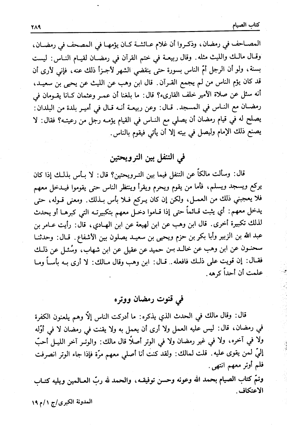 ِ قَالَ: وَقَالَ مَالِكٌ فِي الْحَدَثِ الَّذِي يَذْكُرُهُ: مَا أَدْرَكْتُ النَّاسَ إلَّا وَهُمْ يَلْعَنُونَ الْكَفَرَةَ فِي رَمَضَانَ، قَالَ: لَيْسَ عَلَيْهِ الْعَمَلُ وَلَا أَرَى أَنْ يَعْمَلَ بِهِ وَلَا يَقْنُتَ فِي رَمَضَانَ لَا فِي أَوَّلِهِ وَلَا فِي آخِرِهِ، وَلَا فِي غَيْرِ رَمَضَانَ وَلَا فِي الْوِتْرِ أَصْلًا قَالَ مَالِكٌ: وَالْوِتْرُ آخِرُ اللَّيْلِ أَحَبُّ إلَيَّ لِمَنْ يَقْوَى عَلَيْهِ.
