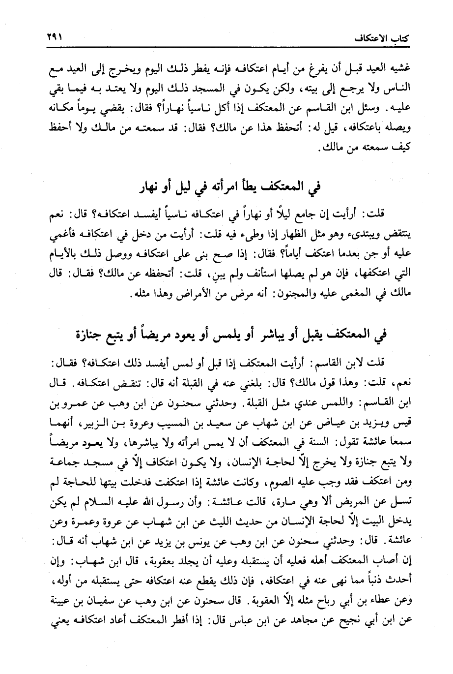 قَالَ ابْنُ الْقَاسِمِ: وَاللَّمْسُ عِنْدِي مِثْلُ الْقُبْلَةِ. وَحَدَّثَنِي سَحْنُونٌ عَنْ ابْنِ وَهْبٍ عَنْ عَمْرِو بْنِ قَيْسٍ وَيَزِيدَ بْنِ عِيَاضٍ عَنْ ابْنِ شِهَابٍ عَنْ سَعِيدِ بْنِ الْمُسَيِّبِ وَعُرْوَةَ بْنِ الزُّبَيْرِ، أَنَّهُمَا سَمِعَا عَائِشَةَ تَقُولُ: السُّنَّةُ فِي الْمُعْتَكِفِ أَنْ لَا يَمَسَّ امْرَأَتَهُ وَلَا يُبَاشِرَهَا، وَلَا يَعُودَ مَرِيضًا وَلَا يَتْبَعَ جِنَازَةً وَلَا يَخْرُجَ إلَّا لِحَاجَةِ الْإِنْسَانِ، وَلَا يَكُونُ اعْتِكَافٌ إلَّا فِي مَسْجِدِ جَمَاعَةٍ وَمَنْ اعْتَكَفَ فَقَدْ وَجَبَ عَلَيْهِ الصَّوْمُ، وَكَانَتْ عَائِشَةُ إذَا اعْتَكَفَتْ فَدَخَلَتْ بَيْتَهَا لِلْحَاجَةِ لَمْ تَسَلْ عَنْ الْمَرِيضِ إلَّا وَهِيَ مَارَّةٌ، قَالَتْ عَائِشَةُ: «وَإِنَّ رَسُولَ اللَّهِ - عَلَيْهِ السَّلَامُ - لَمْ يَكُنْ يَدْخُلُ الْبَيْتَ إلَّا لِحَاجَةِ الْإِنْسَانِ» مِنْ حَدِيثِ اللَّيْثِ عَنْ ابْنِ شِهَابٍ عَنْ عُرْوَةَ وَعَمْرَةَ وَعَنْ عَائِشَةَ. قَالَ: وَحَدَّثَنِي سَحْنُونٌ عَنْ ابْنِ وَهْبٍ عَنْ يُونُسَ بْنِ يَزِيدَ عَنْ ابْنِ شِهَابٍ أَنَّهُ قَالَ: إنْ أَصَابَ الْمُعْتَكِفُ أَهْلَهُ فَعَلَيْهِ أَنْ يَسْتَقْبِلَهُ وَعَلَيْهِ أَنْ يُجْلَدَ بِعُقُوبَةٍ، قَالَ ابْنُ شِهَابٍ: وَإِنْ أَحْدَثَ ذَنْبًا مِمَّا نُهِيَ عَنْهُ فِي اعْتِكَافِهِ، فَإِنَّ ذَلِكَ يَقْطَعُ عَنْهُ اعْتِكَافَهُ حَتَّى يَسْتَقْبِلَهُ مِنْ أَوَّلِهِ، وَعَنْ عَطَاءِ بْنِ أَبِي رَبَاحٍ مِثْلُهُ إلَّا الْعُقُوبَةَ.