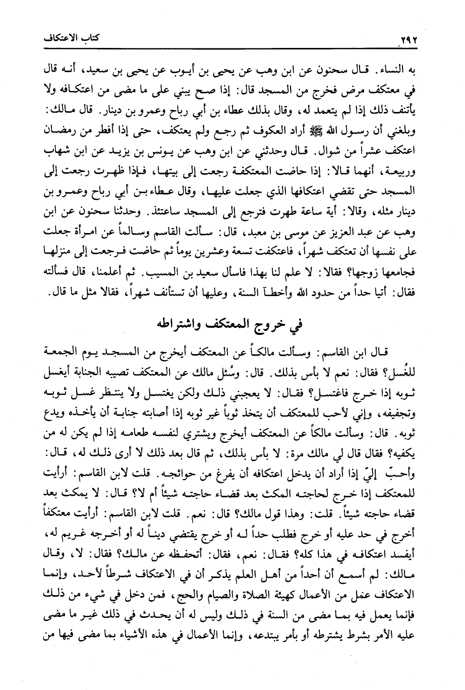 قُلْتُ لِابْنِ الْقَاسِمِ: أَرَأَيْتَ مُعْتَكِفًا أُخْرِجَ فِي حَدٍّ عَلَيْهِ أَوْ خَرَجَ فَطَلَبَ حَدًّا لَهُ أَوْ خَرَجَ يَقْتَضِي دَيْنًا لَهُ أَوْ أَخْرَجَهُ غَرِيمٌ لَهُ، أَيَفْسُدُ اعْتِكَافُهُ فِي هَذَا كُلِّهِ؟ فَقَالَ: نَعَمْ، فَقَالَ: أَتَحْفَظُهُ عَنْ مَالِكٍ؟ فَقَالَ: لَا، وَقَالَ مَالِكٌ: لَمْ أَسْمَعْ أَنَّ أَحَدًا مِنْ أَهْلِ الْعِلْمِ يَذْكُرُ أَنَّ فِي الِاعْتِكَافِ شَرْطًا لِأَحَدٍ، وَإِنَّمَا الِاعْتِكَافُ عَمَلٌ مِنْ الْأَعْمَالِ كَهَيْئَةِ الصَّلَاةِ وَالصِّيَامِ وَالْحَجِّ، فَمَنْ دَخَلَ فِي شَيْءٍ مِنْ ذَلِكَ فَإِنَّمَا يَعْمَلُ فِيهِ بِمَا مَضَى مِنْ السُّنَّةِ فِي ذَلِكَ وَلَيْسَ لَهُ أَنْ يُحْدِثَ فِي ذَلِكَ غَيْرَ مَا مَضَى عَلَيْهِ الْأَمْرُ بِشَرْطٍ يَشْتَرِطُهُ أَوْ بِأَمْرٍ يَبْتَدِعُهُ، وَإِنَّمَا الْأَعْمَالُ فِي هَذِهِ الْأَشْيَاءِ بِمَا مَضَى فِيهَا مِنْ