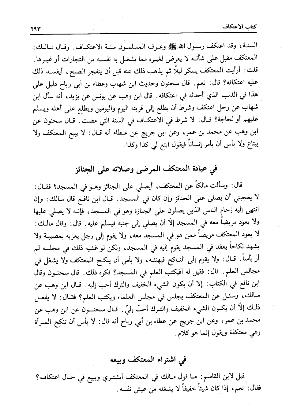 فِي عِيَادَةِ الْمُعْتَكِفِ الْمَرْضَى وَصَلَاتِهِ عَلَى الْجَنَائِزِ قَالَ: وَسَأَلْتُ مَالِكًا عَنْ الْمُعْتَكِفِ، أَيُصَلِّي عَلَى الْجَنَائِزِ وَهُوَ فِي الْمَسْجِدِ؟ فَقَالَ: لَا يُعْجِبُنِي أَنْ يُصَلِّيَ عَلَى الْجَنَائِزِ وَإِنْ كَانَ فِي الْمَسْجِدِ.