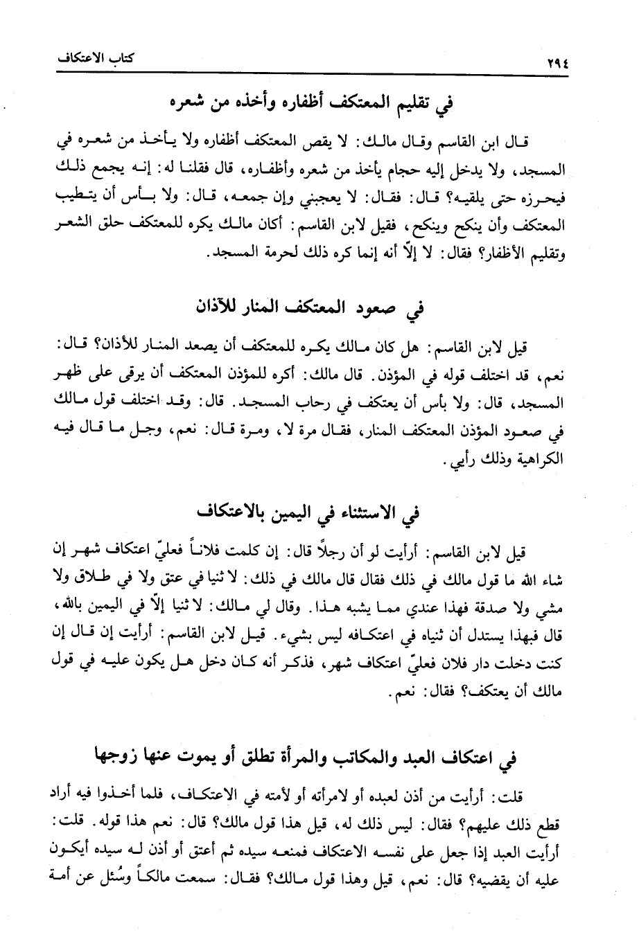 فِي صُعُودِ الْمُعْتَكِفِ الْمَنَارَ لِلْأَذَانِ قِيلَ لِابْنِ الْقَاسِمِ: هَلْ كَانَ مَالِكٌ يَكْرَهُ لِلْمُعْتَكِفِ أَنْ يَصْعَدَ الْمَنَارَ لِلْأَذَانِ؟