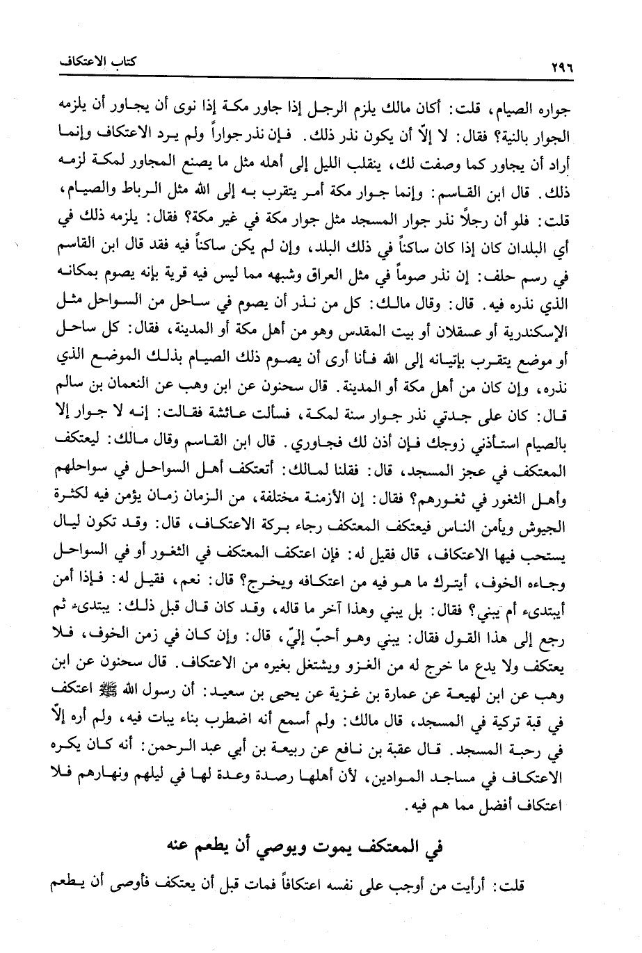 قَالَ سَحْنُونٌ عَنْ ابْنِ وَهْبٍ عَنْ ابْنِ لَهِيعَةَ عَنْ عُمَارَةَ بْنِ غَزِيَّةَ عَنْ يَحْيَى بْنِ سَعِيدٍ: «أَنَّ رَسُولَ اللَّهِ - صَلَّى اللَّهُ عَلَيْهِ وَسَلَّمَ - اعْتَكَفَ فِي قُبَّةٍ تُرْكِيَّةٍ فِي الْمَسْجِدِ» ، قَالَ مَالِكٌ: وَلَمْ أَسْمَعْ أَنَّهُ اضْطَرَبَ بِنَاءٌ يُبَاتُ فِيهِ، وَلَمْ أَرَهُ إلَّا فِي رَحَبَةِ الْمَسْجِدِ.