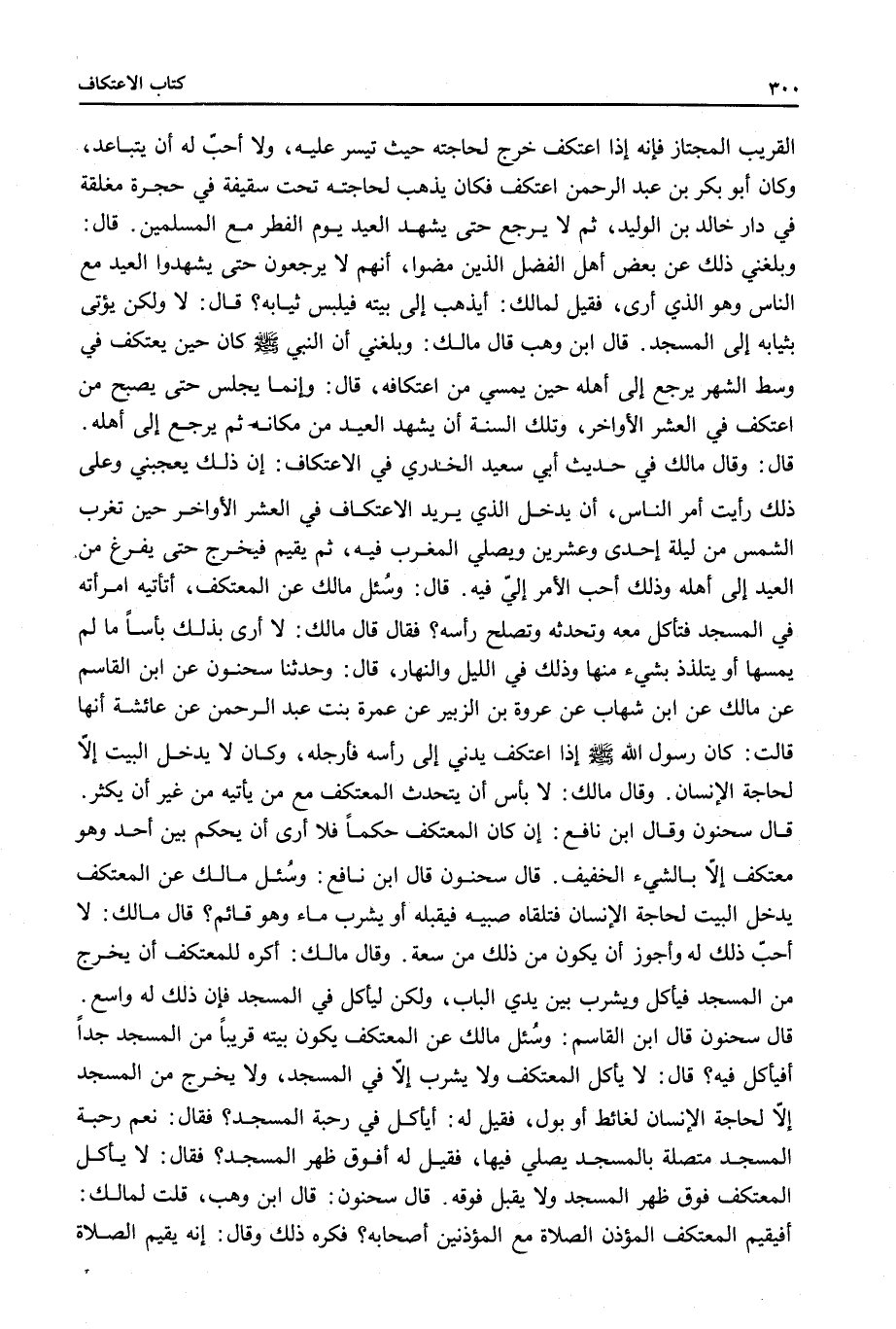 قَالَ: وَسُئِلَ مَالِكٌ عَنْ الْمُعْتَكِفِ، أَتَأْتِيهِ امْرَأَتُهُ فِي الْمَسْجِدِ فَتَأْكُلُ مَعَهُ وَتُحَدِّثُهُ وَتُصْلِحُ رَأْسَهُ؟ فَقَالَ قَالَ مَالِكٌ: لَا أَرَى بِذَلِكَ بَأْسًا مَا لَمْ يَمَسَّهَا أَوْ يَتَلَذَّذْ بِشَيْءٍ مِنْهَا وَذَلِكَ فِي اللَّيْلِ وَالنَّهَارِ، قَالَ: وَحَدَّثَنَا سَحْنُونٌ عَنْ ابْنِ الْقَاسِمِ عَنْ مَالِكٍ عَنْ ابْنِ شِهَابٍ عَنْ عُرْوَةَ بْنِ الزُّبَيْرِ عَنْ عَمْرَةَ بِنْتِ عَبْدِ الرَّحْمَنِ عَنْ عَائِشَةَ أَنَّهَا قَالَتْ: «كَانَ رَسُولُ اللَّهِ - صَلَّى اللَّهُ عَلَيْهِ وَسَلَّمَ - إذَا اعْتَكَفَ يُدْنِي إلَيَّ رَأْسَهُ فَأُرَجِّلُهُ، وَكَانَ لَا يَدْخُلُ الْبَيْتَ إلَّا لِحَاجَةِ الْإِنْسَانِ» . وَقَالَ مَالِكٌ: لَا بَأْسَ أَنْ يَتَحَدَّثَ الْمُعْتَكِفُ مَعَ مَنْ يَأْتِيهِ مِنْ غَيْرِ أَنْ يُكْثِرَ.