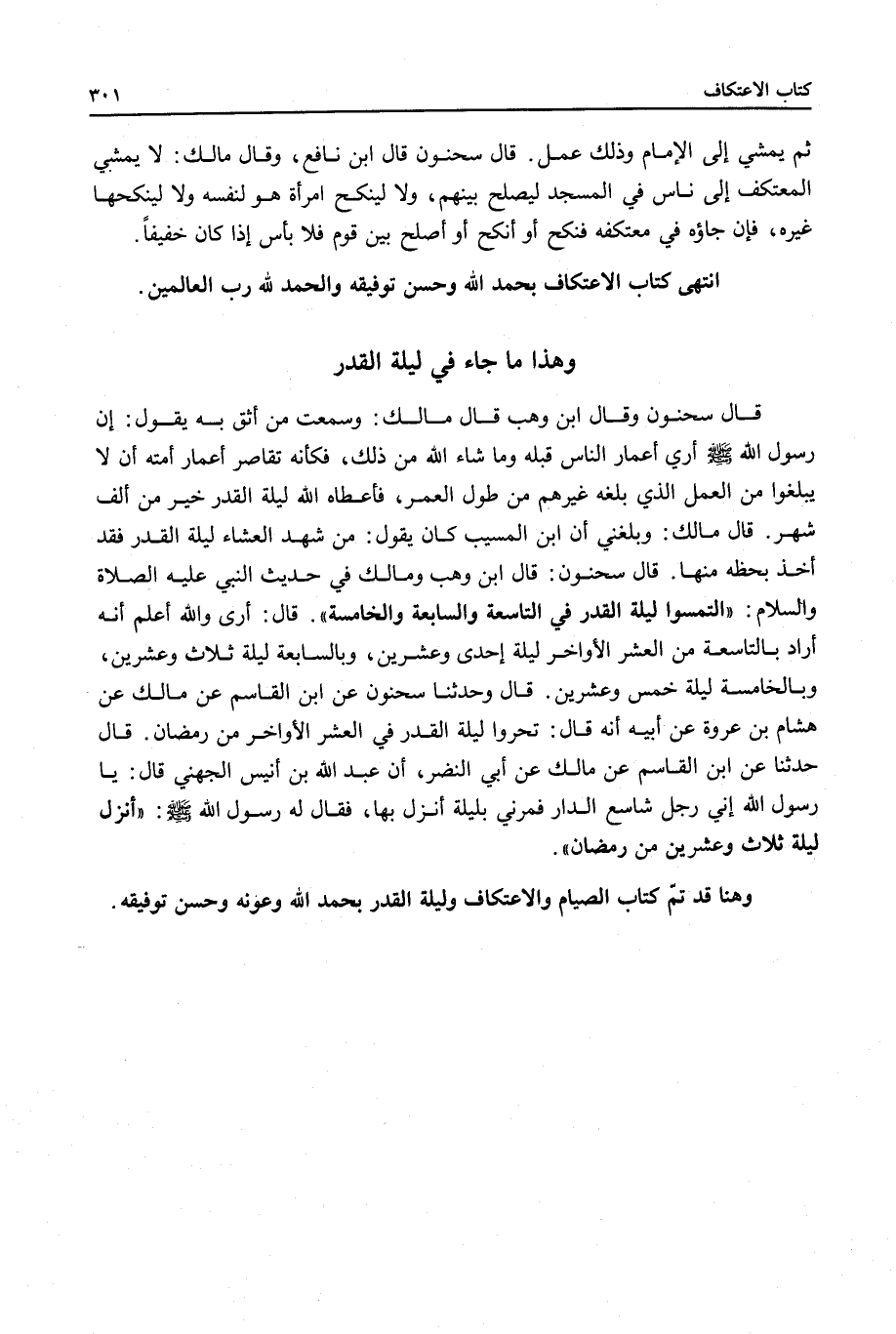 قَالَ سَحْنُونٌ: قَالَ ابْنُ وَهْبٍ وَمَالِكٌ فِي حَدِيثِ النَّبِيِّ - عَلَيْهِ الصَّلَاةُ وَالسَّلَامُ -: «الْتَمِسُوا لَيْلَةَ الْقَدْرِ فِي التَّاسِعَةِ وَالسَّابِعَةِ وَالْخَامِسَةِ» .